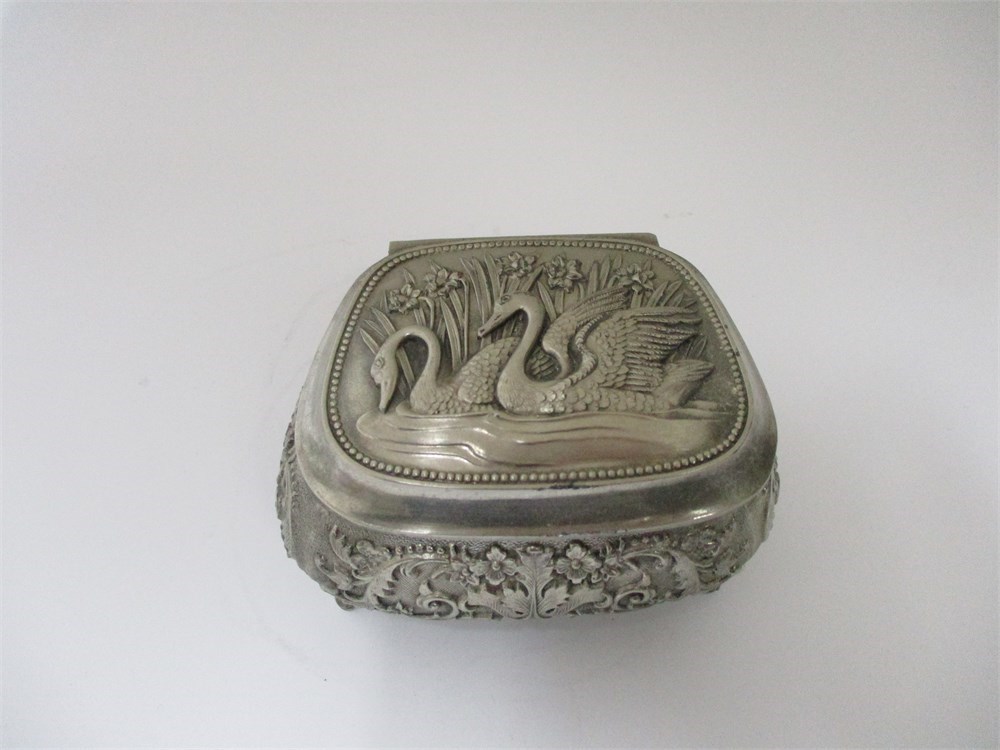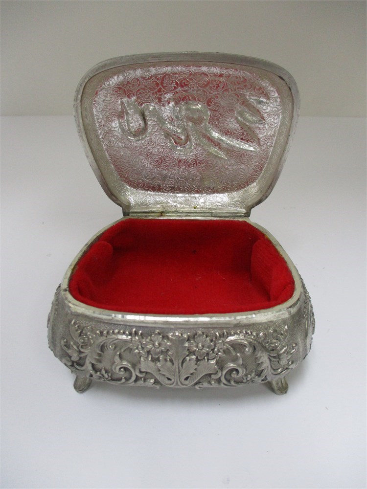 This is a Vintage Metal Hinged Footed Trinket Box.  It has some lovely detailing throughout the piece in Repousse style of Swans, Reeds and Floral detail even on the bottom.  It is lined in red velvet fabric. The hinge is in good working condition and opens and closes as it should.  It measures 3.75" long x 3" wide x 1.75" tall.