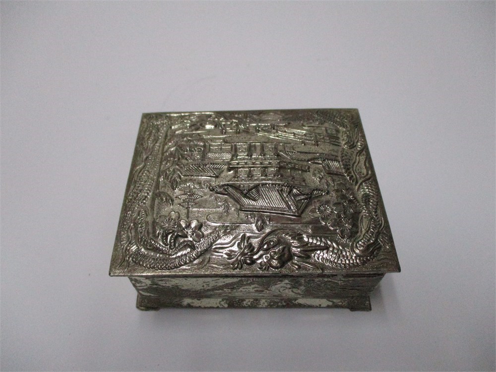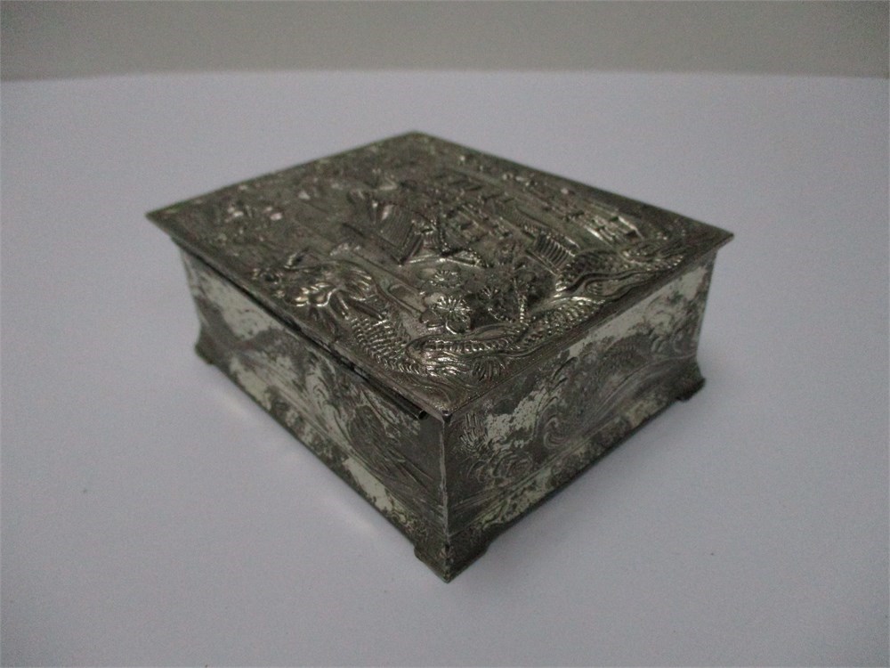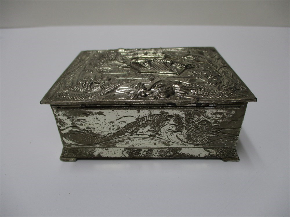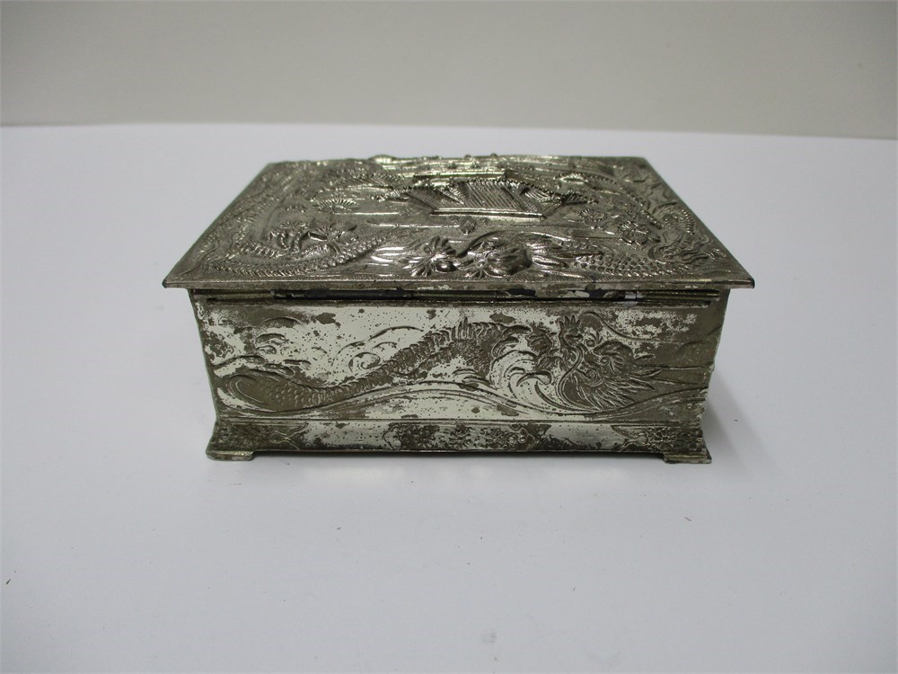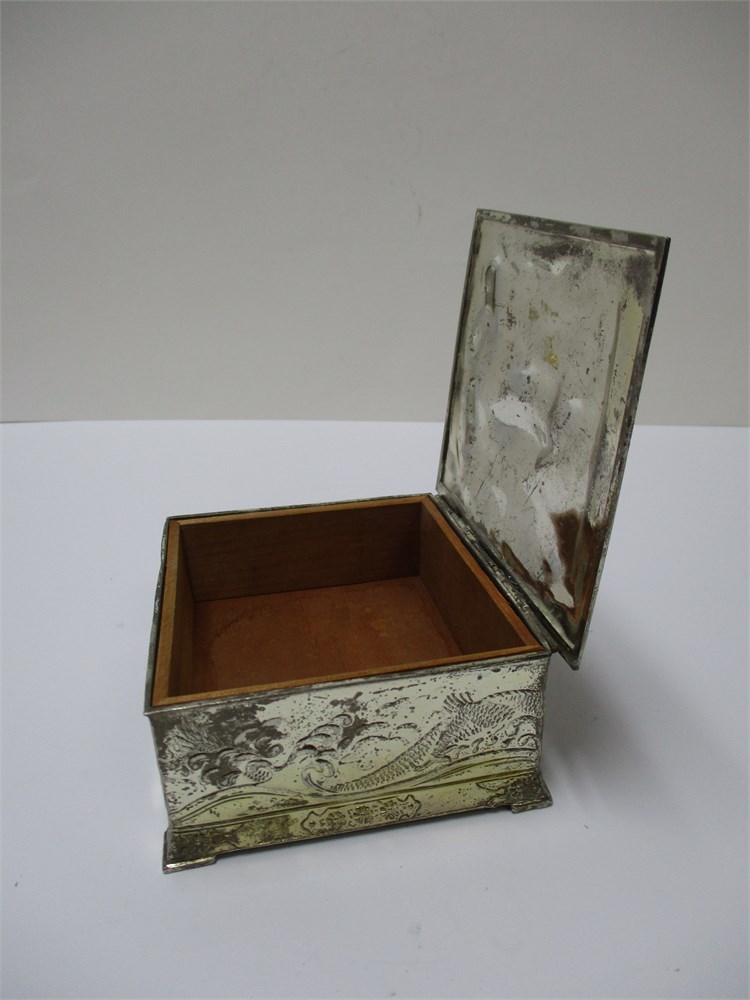 This is a Vintage Metal, Hinged, Wood Lined Cigarette Box .  It has some lovely detailing throughout the piece in Repousse style. Japanese Pagoda on the lid surrounded with images of dragons and also on the sides of the box.  It is lined in wood, perfect for cigarettes. The hinge is in good working condition and opens and closes as it should.  There is some metal loss throughout but it is in nice condition and marked Japan. It measures 4.25" long x 3.25" wide x 1.25" tall.