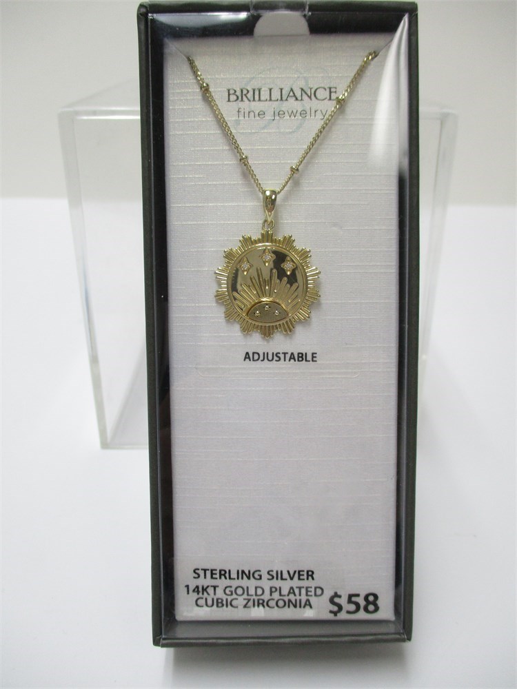 This is a Brilliance Sterling, CZ & 14KGP, Sun Dusk/Sunrise Pendant Necklace, with adjustable length chain, 16,18,20". It is boxed and ready for gifting.
