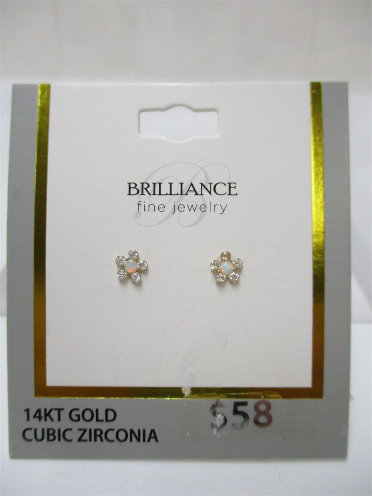 Brilliance, 14KT Yellow Gold, CZ & Created Opal, Small Floral Stud Earrings.  Surgical Steel Posts.  **Not recommended for children ages 3 and under.