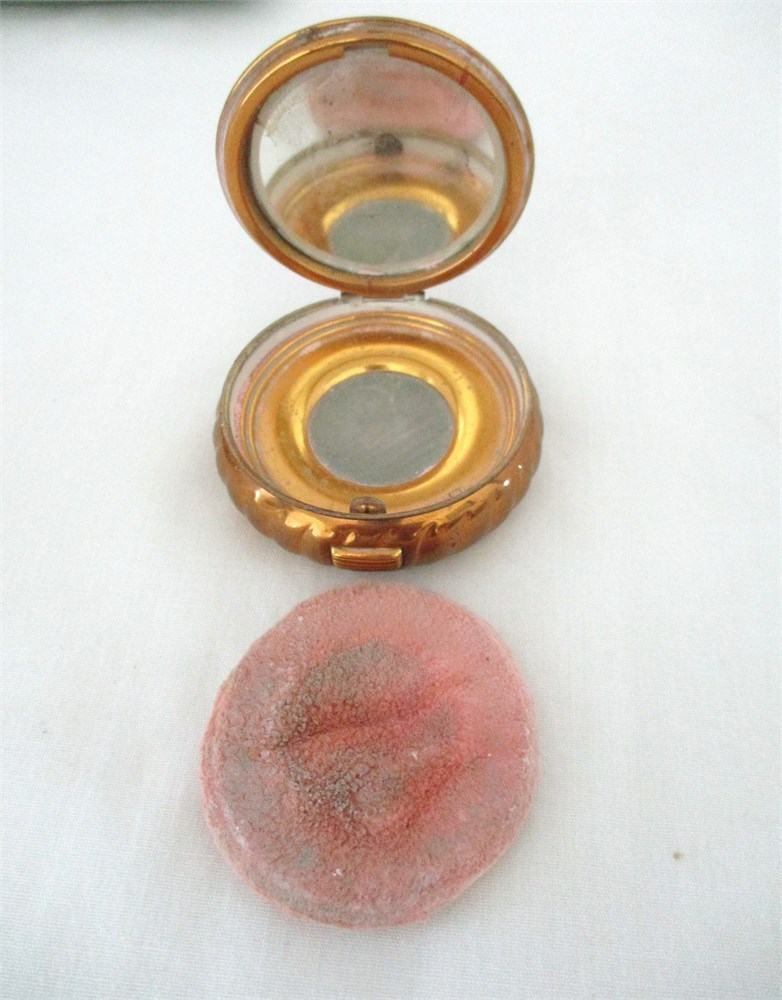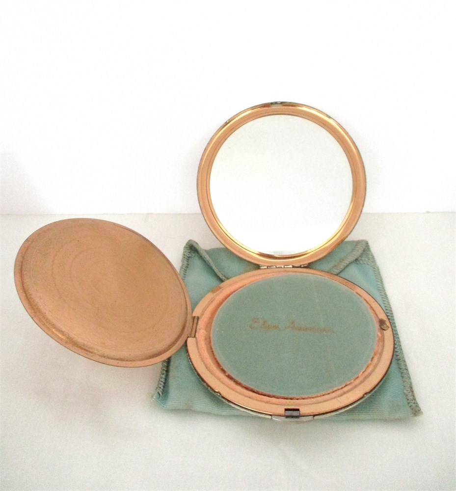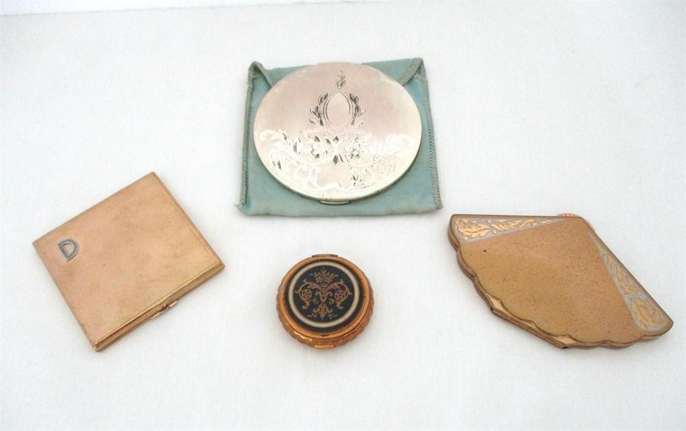 A vintage, set of 4, Mirrored Powder Compacts.  One is Elgin American in its original fabric sleeve,  the Fan shape is Wadsworth, the small round enamel is Evans and the square one with a "D" monogram is not marked.  All in good vintage condition.  Mirrors are clean with no issues.  All open and close as they should, some metal wear consistent with age and use.  The largest is the round Elgin, 4" in diameter and the smallest, Evans is 1.75" in diameter.
