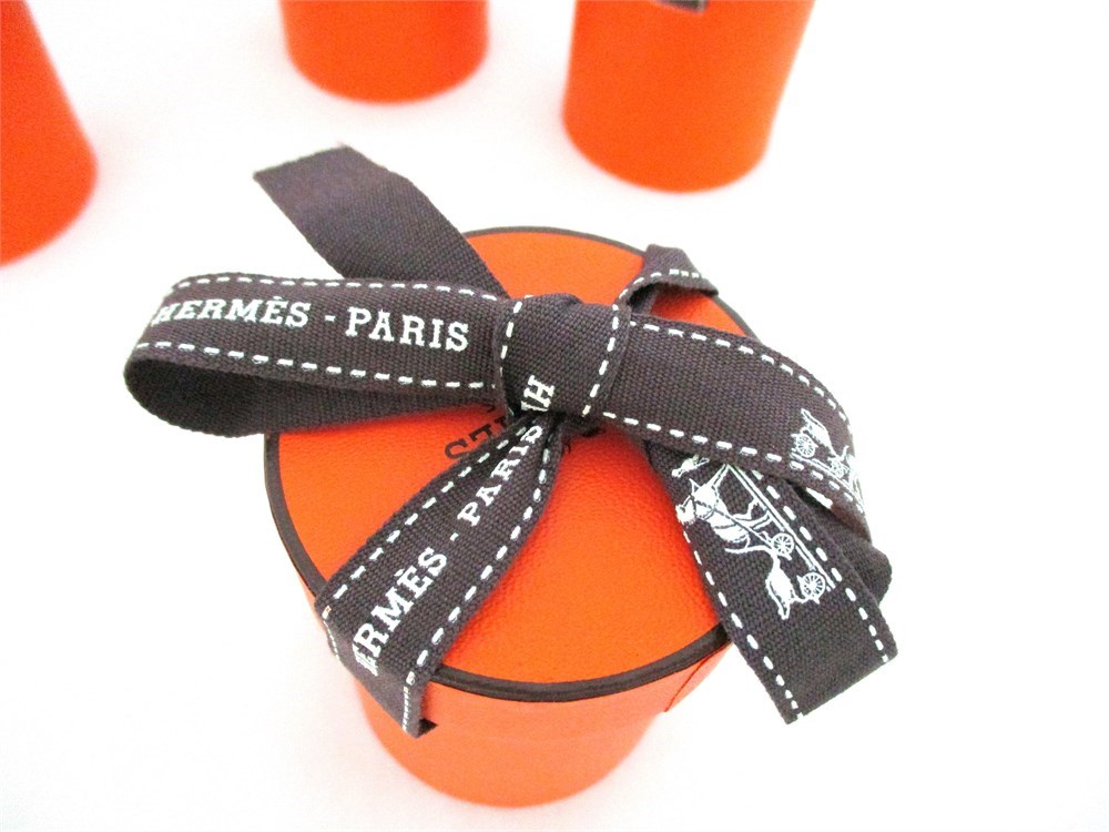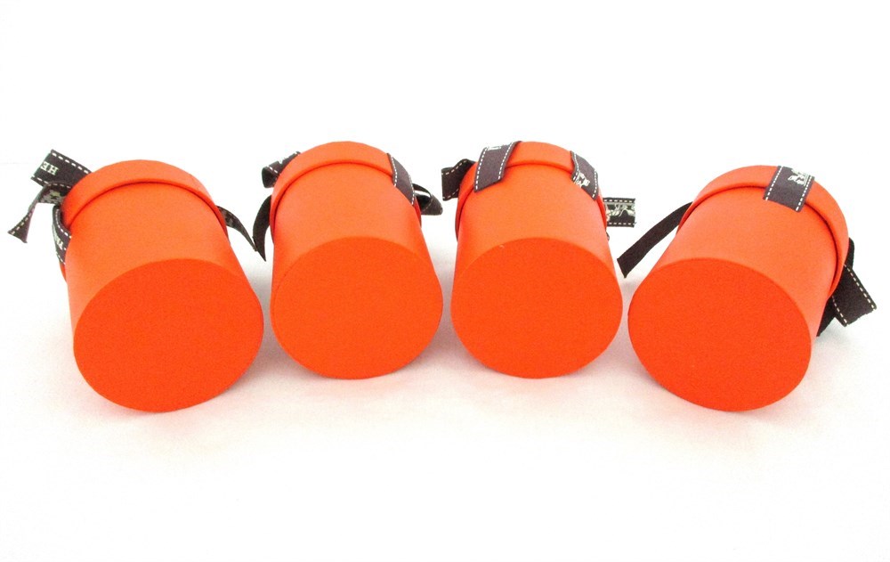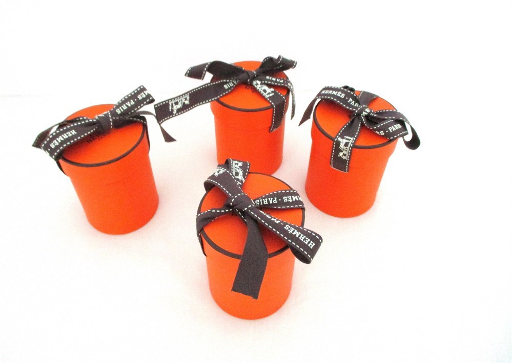 This is a set of 4, AUTHENTIC, HERMES, Twilly Scarf Boxes with HERMES Ribbon.  All boxes are empty.  Made of heavy cardboard and each small gift box in the iconic orange color along with the luxurious brand character of HERMES PARIS on the top of the box.  All are in wonderful and unused condition.  Each box stands 2 7/8" tall x 2" in diameter.