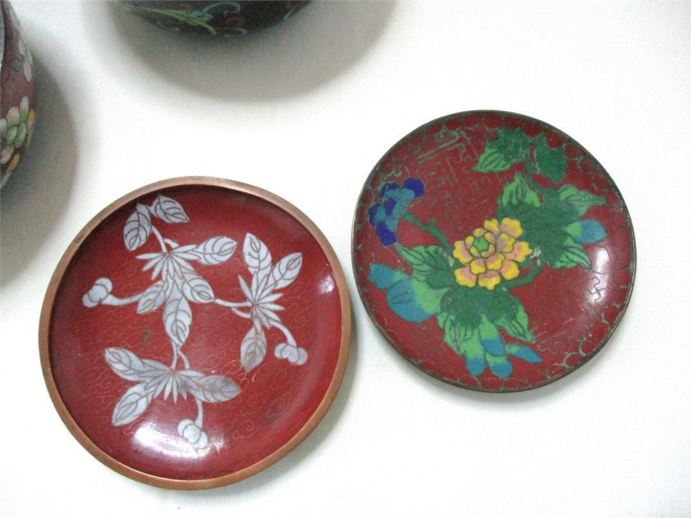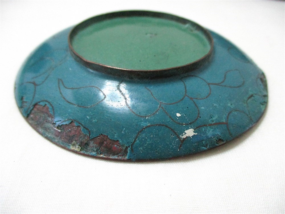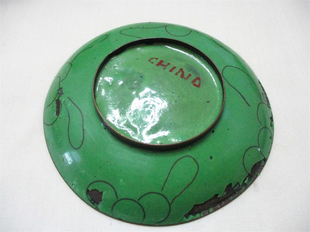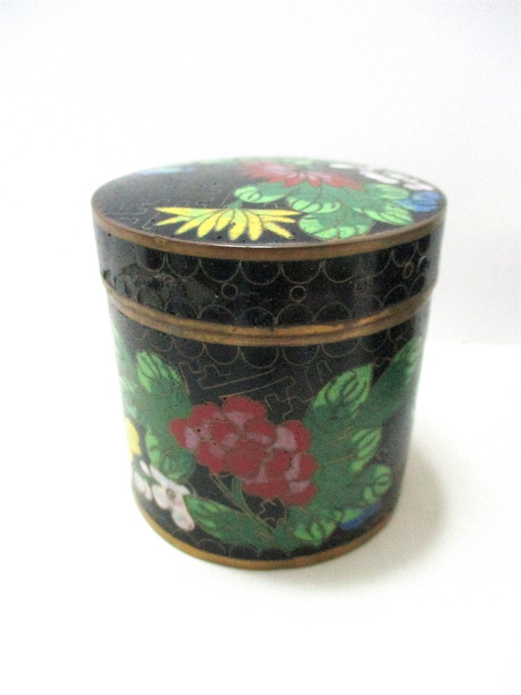 A wonderful 7 piece lot of vintage Cloissonne pieces including, 3 Bowls, Lidded Cannister, Hinged Box, and 2 small round Trinket Dishes. The colors are bright and vivid and designs are wonderful.  All pieces are in great condition with only normal age related wear, but there is some enamel loss on the bottom of the two trinket trays, see last two pictures. The largest pieces are the bowls measuring 4.25" in diameter, the cannister measuring 3" tall x 3" in diameter, the smallest is the round hinged box measuring 1 5/8" in diameter x 1.25" tall. Lovely collection.