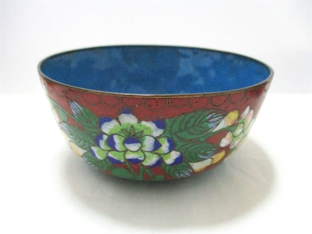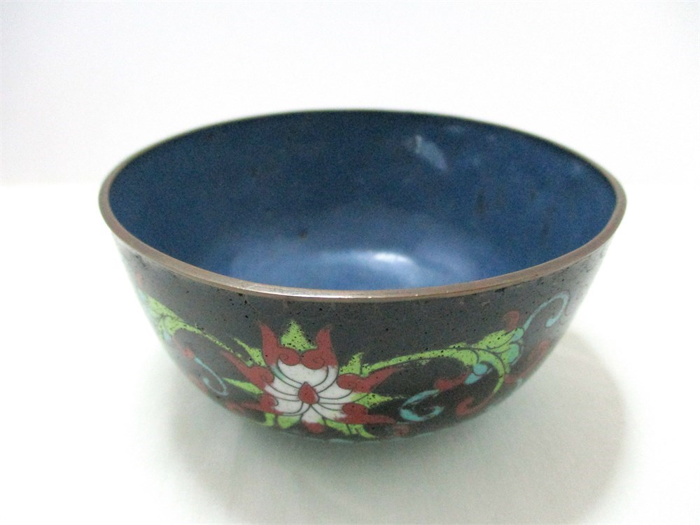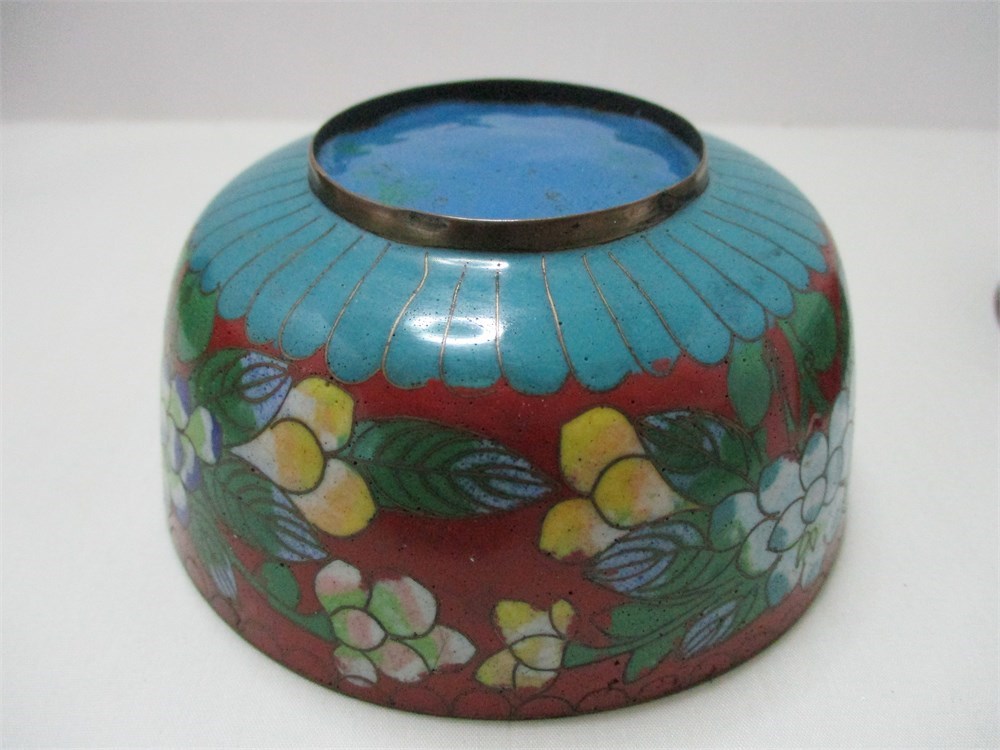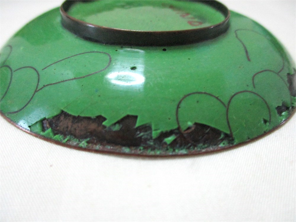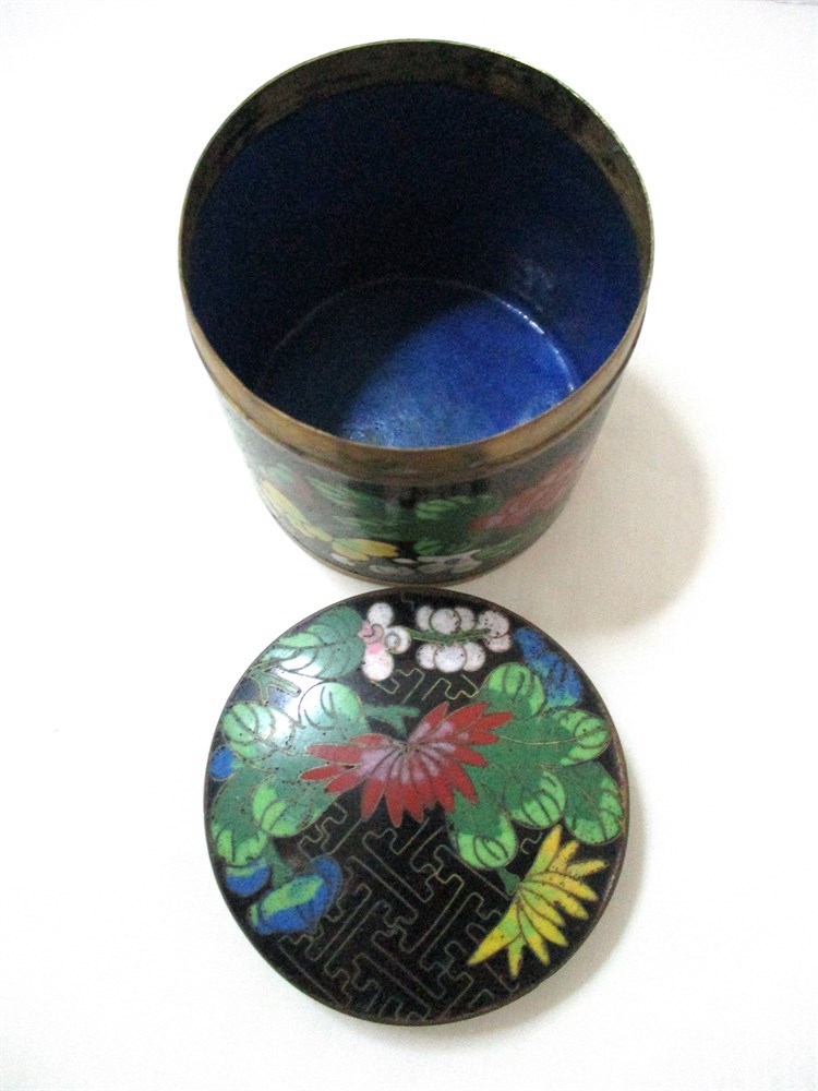 A wonderful 7 piece lot of vintage Cloissonne pieces including, 3 Bowls, Lidded Cannister, Hinged Box, and 2 small round Trinket Dishes. The colors are bright and vivid and designs are wonderful.  All pieces are in great condition with only normal age related wear, but there is some enamel loss on the bottom of the two trinket trays, see last two pictures. The largest pieces are the bowls measuring 4.25" in diameter, the cannister measuring 3" tall x 3" in diameter, the smallest is the round hinged box measuring 1 5/8" in diameter x 1.25" tall. Lovely collection.