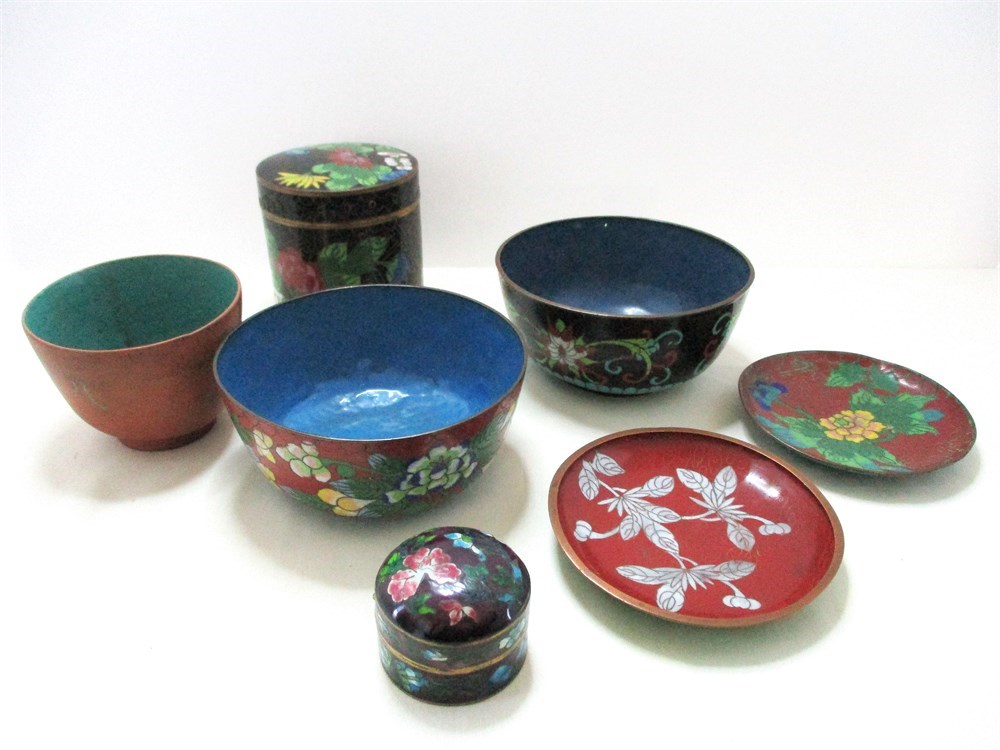 Lot of 7, Vintage, Cloissonne, Bowls, Trinket Dishes, Canister and Hinged Box