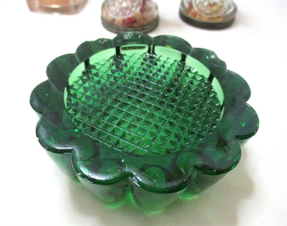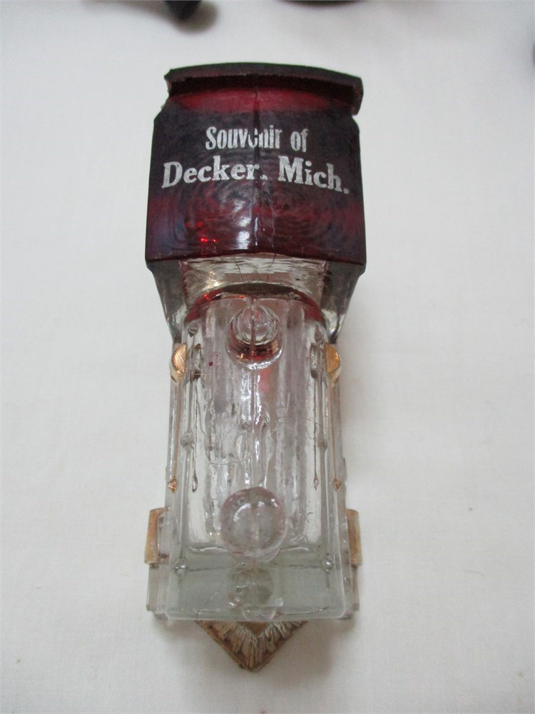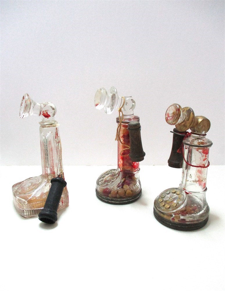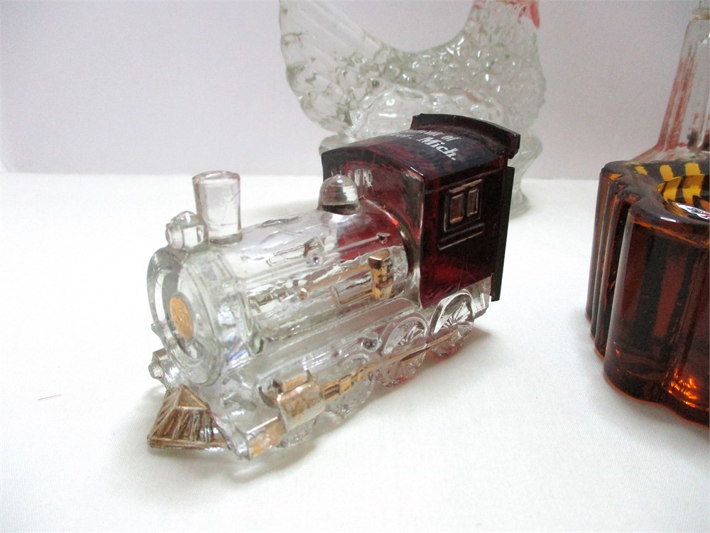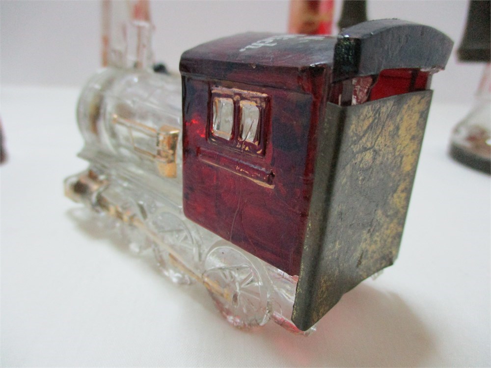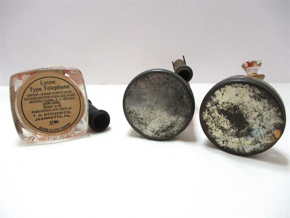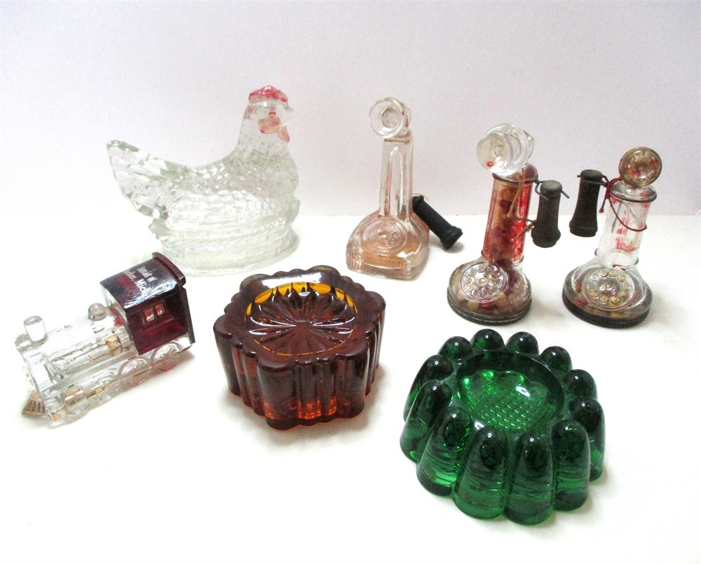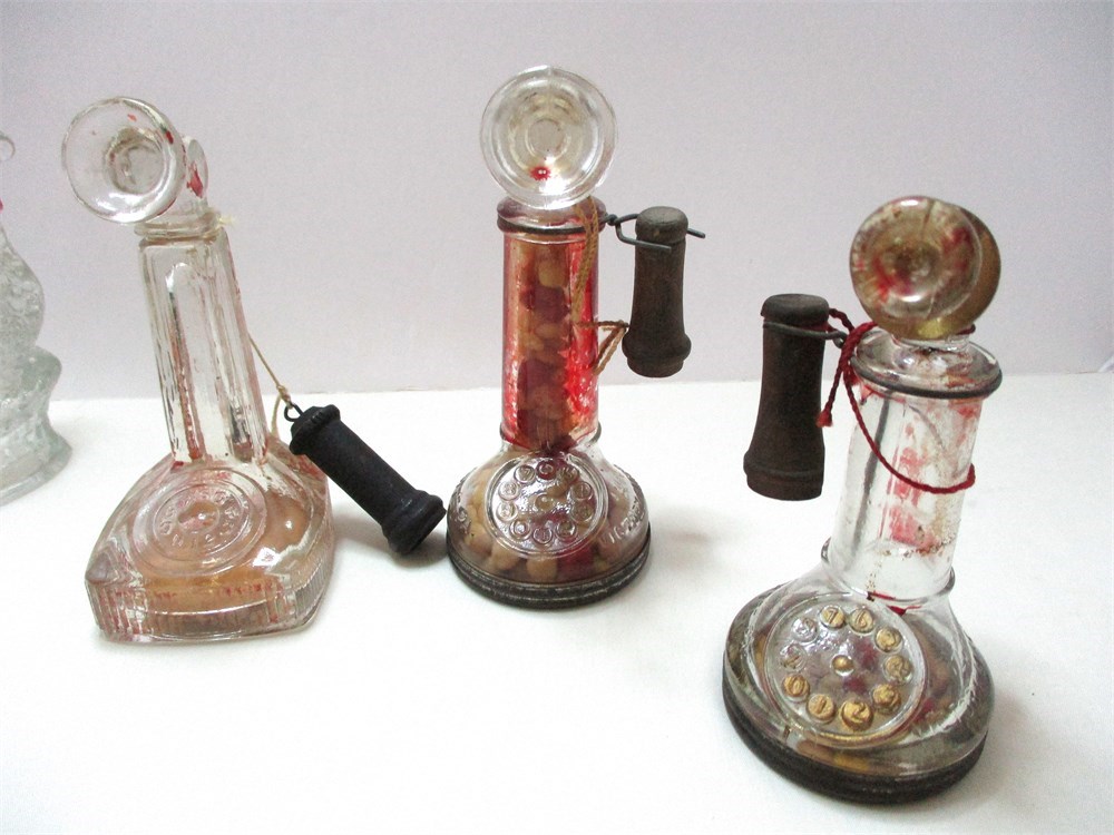 This is a wonderful eclectic grouping consisting of 4 vintage Christmas candy containers, 3 telephone and one train, some with original candy.  Two heavy glass piano leg insulators, one in amber and one green, very interesting designs and the colors are rich and deep.  One figural glass Hen on Nest candy container, top only.  All are in great vintage condition, except there is a chip to one of the locomotive wheels, see last picture.   Nice eclectic lot !