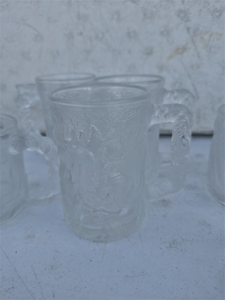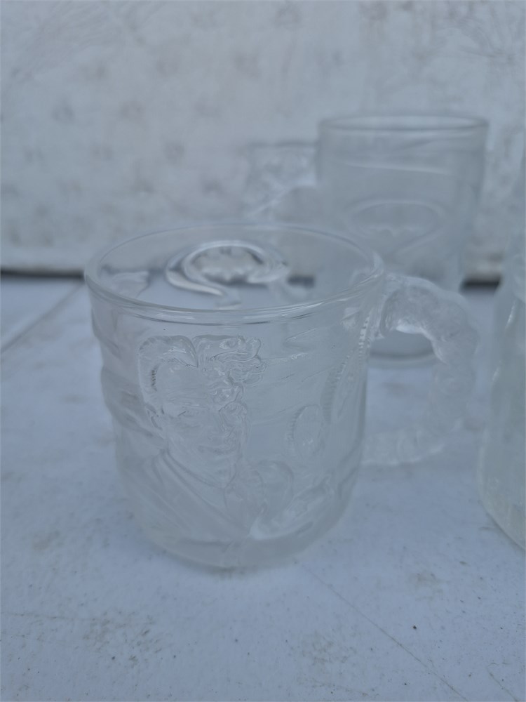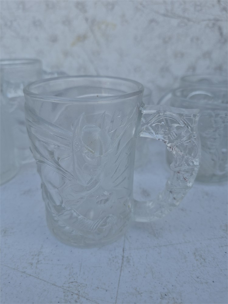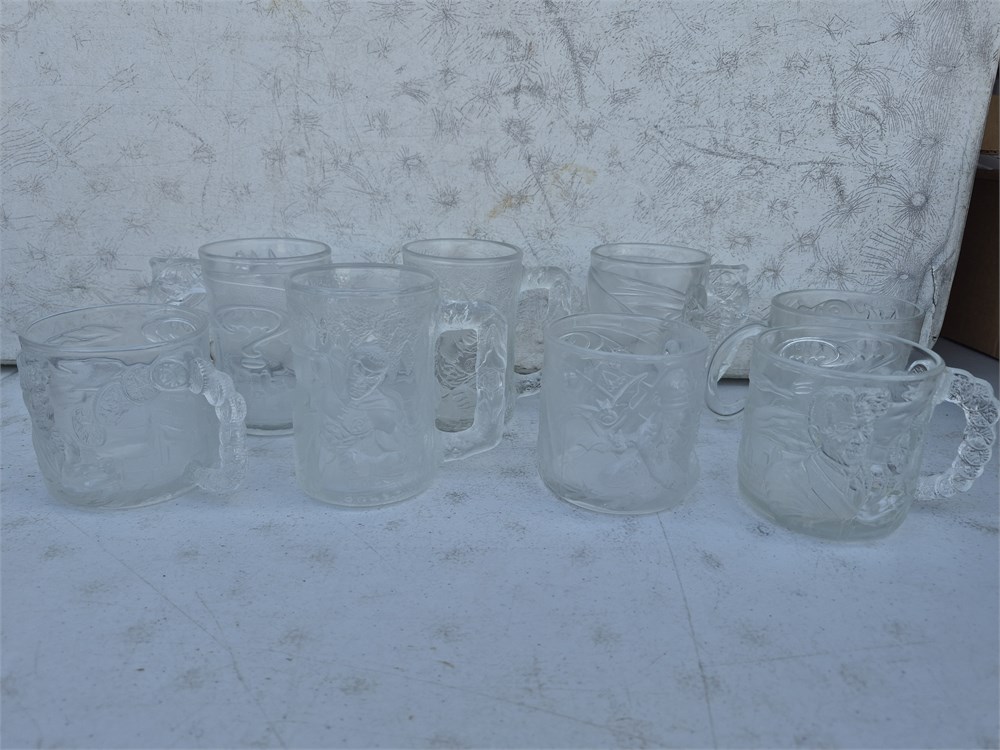 Vintage Glass McDonalds Batman Forever Collectible Mugs. There are eight mugs total.