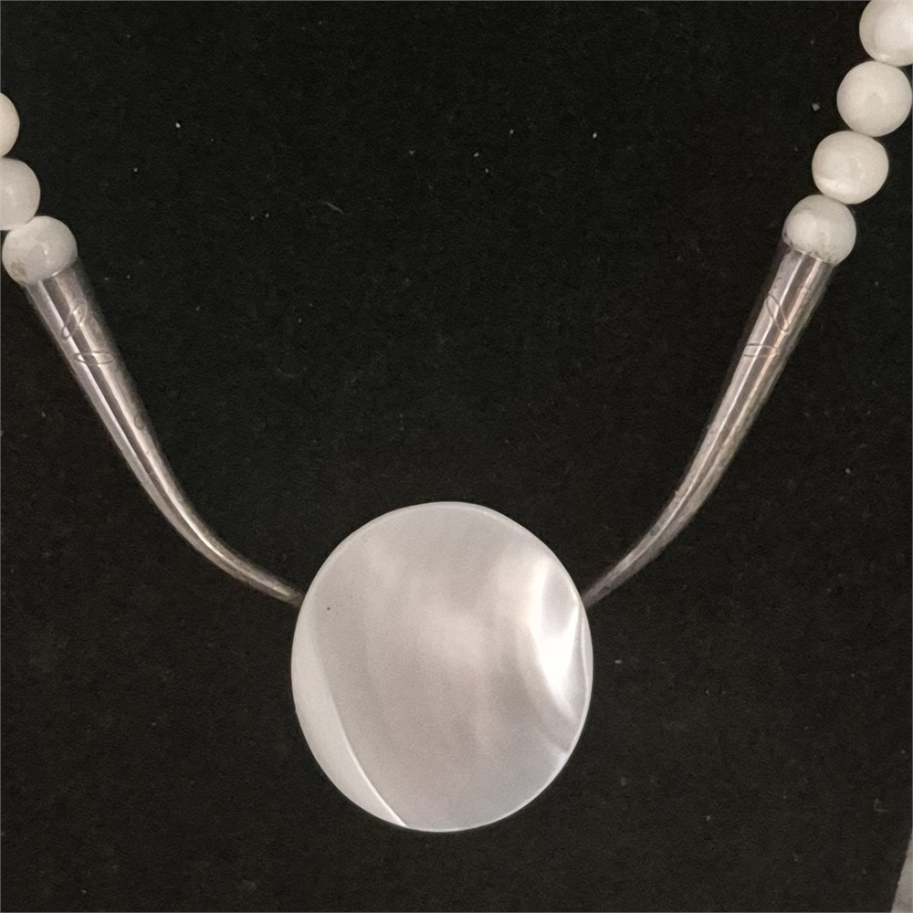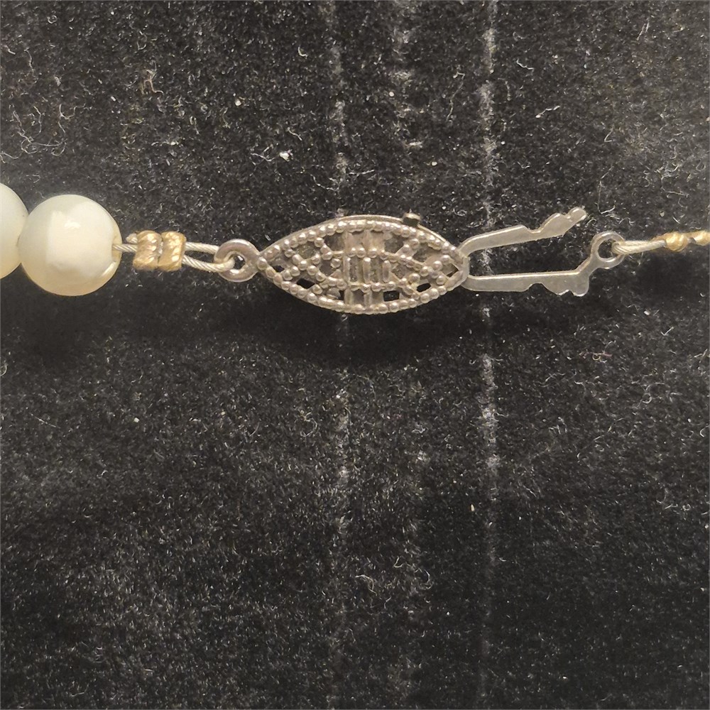 >  stunning vintage estate necklace features mother of pearl beading with a sterling silver clasp, measuring 18 inches in length