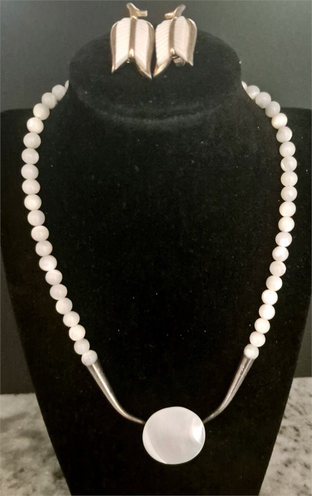 VINTAGE MOP BEADED & STERLING SILVER 18" NECKLACE & Trifari Posts [VC]