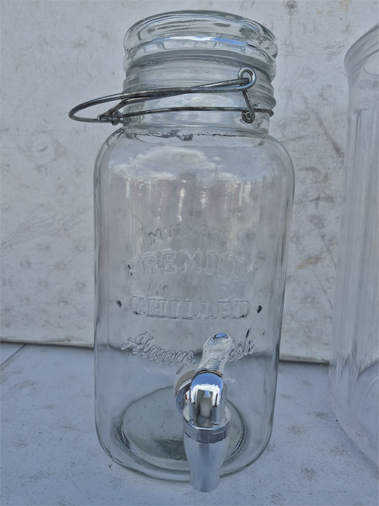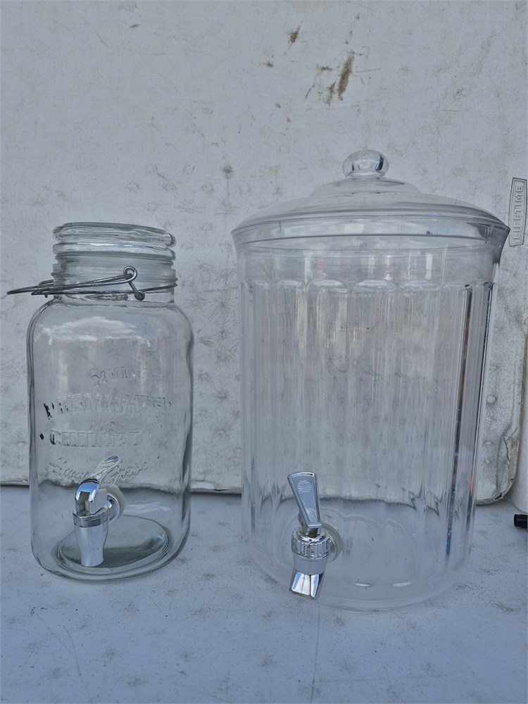 Two large drink dispensers. One is glass the other glass.
