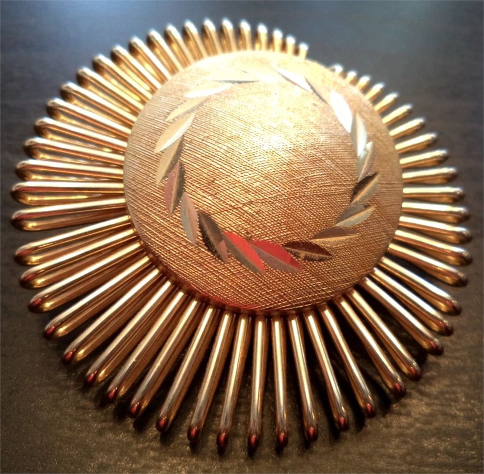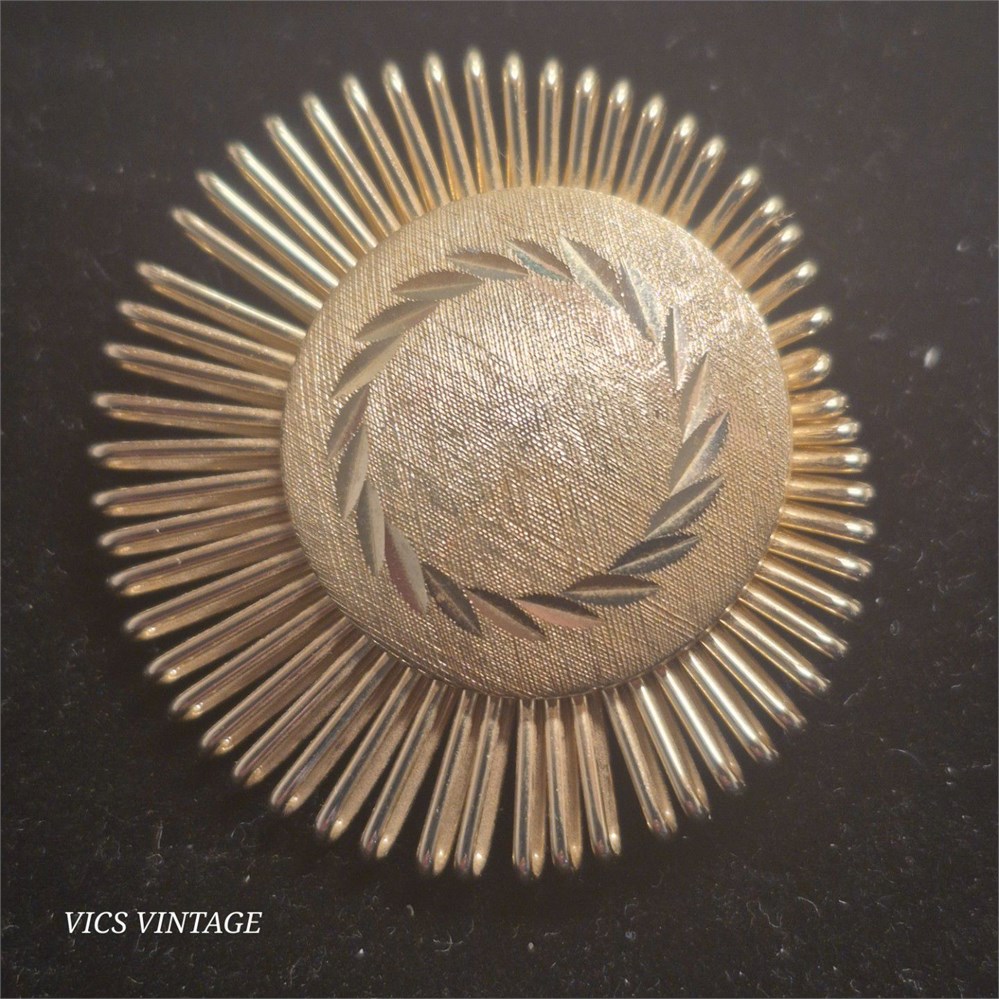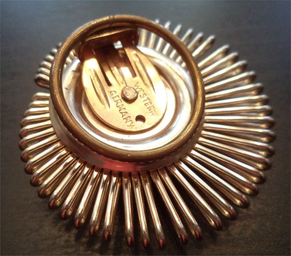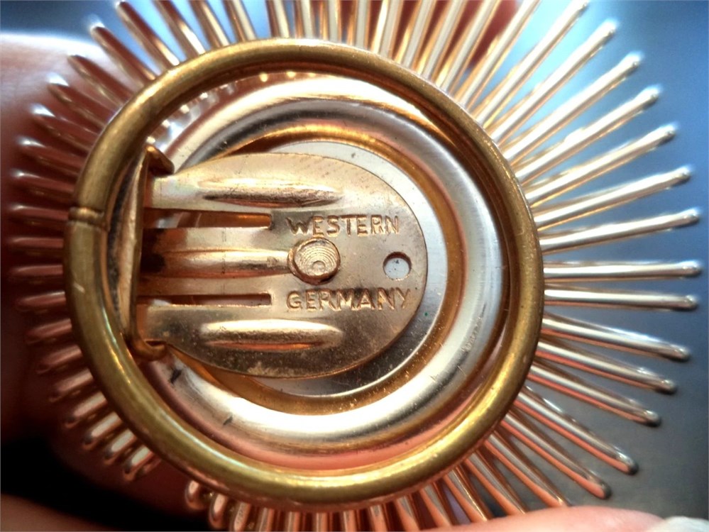 The product is a stunning vintage estate brooch from West Germany, featuring a gold tone clip design.