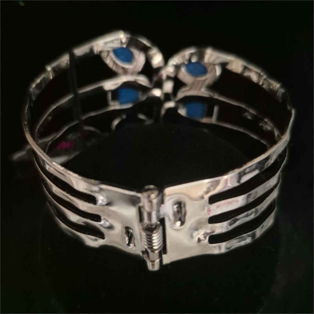 Dotted with oval and square blue beads, hammered silver bars asymmetrically connect into two scalloped silver frames around the wrist,
