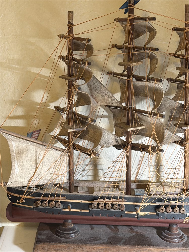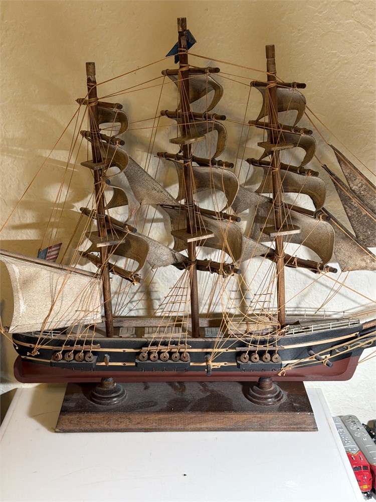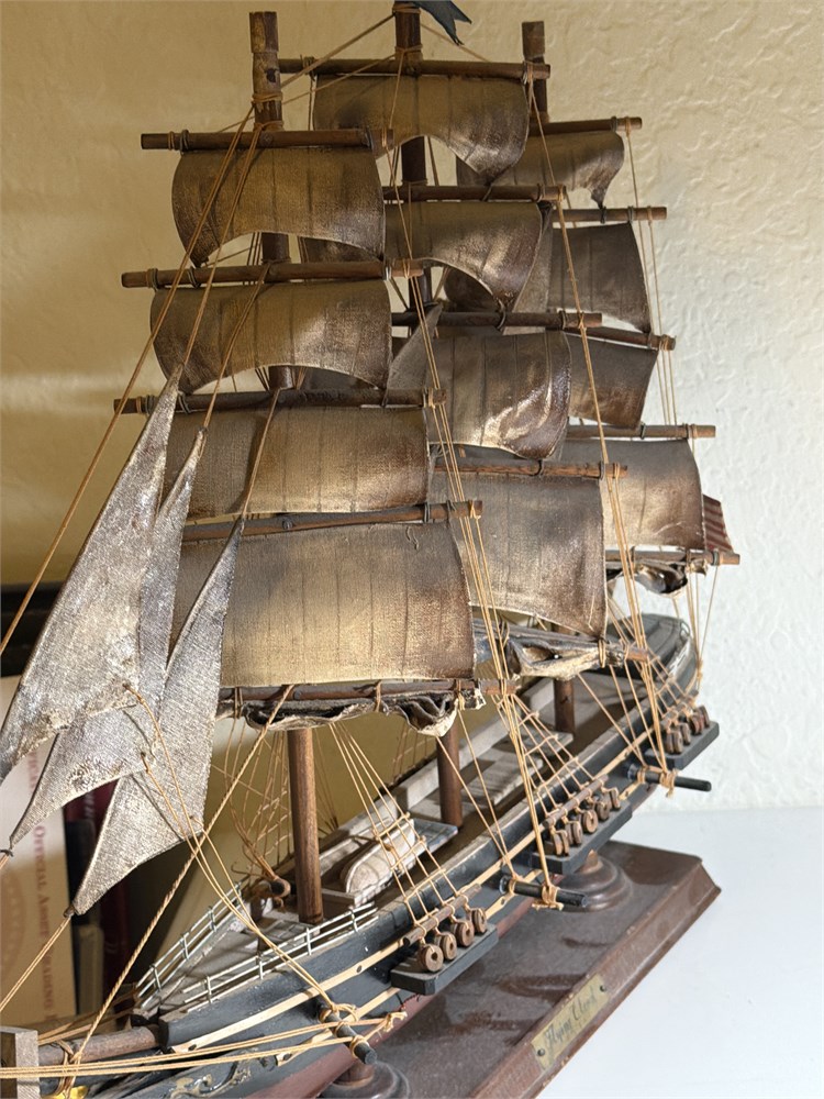 We have a very rare unique pirate ship 20 inches long by 15 inches tall has all the mask built on a wood flying cloud, 1831