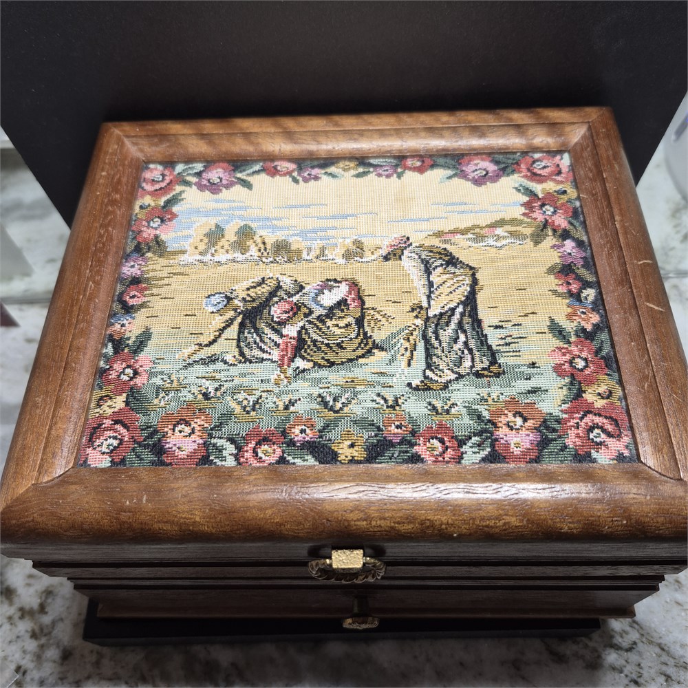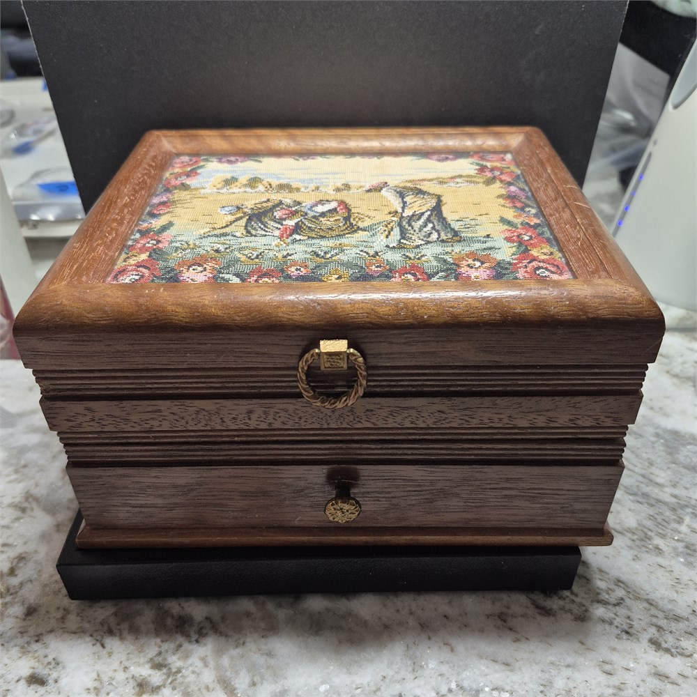 Vintage cruel top mahogany jewelry box complete with WORKING musical drawer when