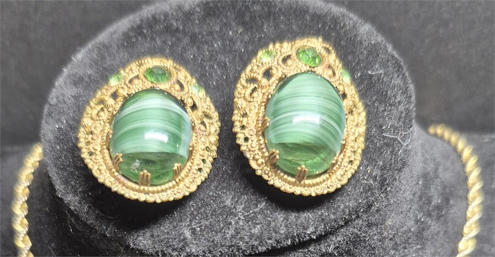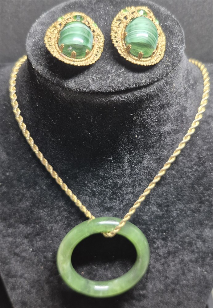 Vintage Jade Circle on Gold tone serpentine chain & German Earrings match [VC]