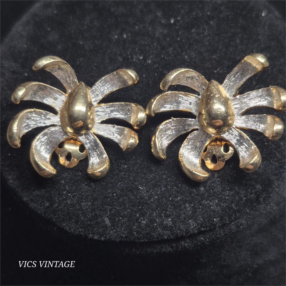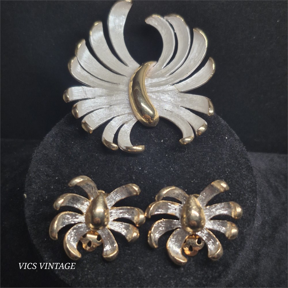 Vintage white brushed gold tone swirl pin brooch anemone & Earrings [VC]