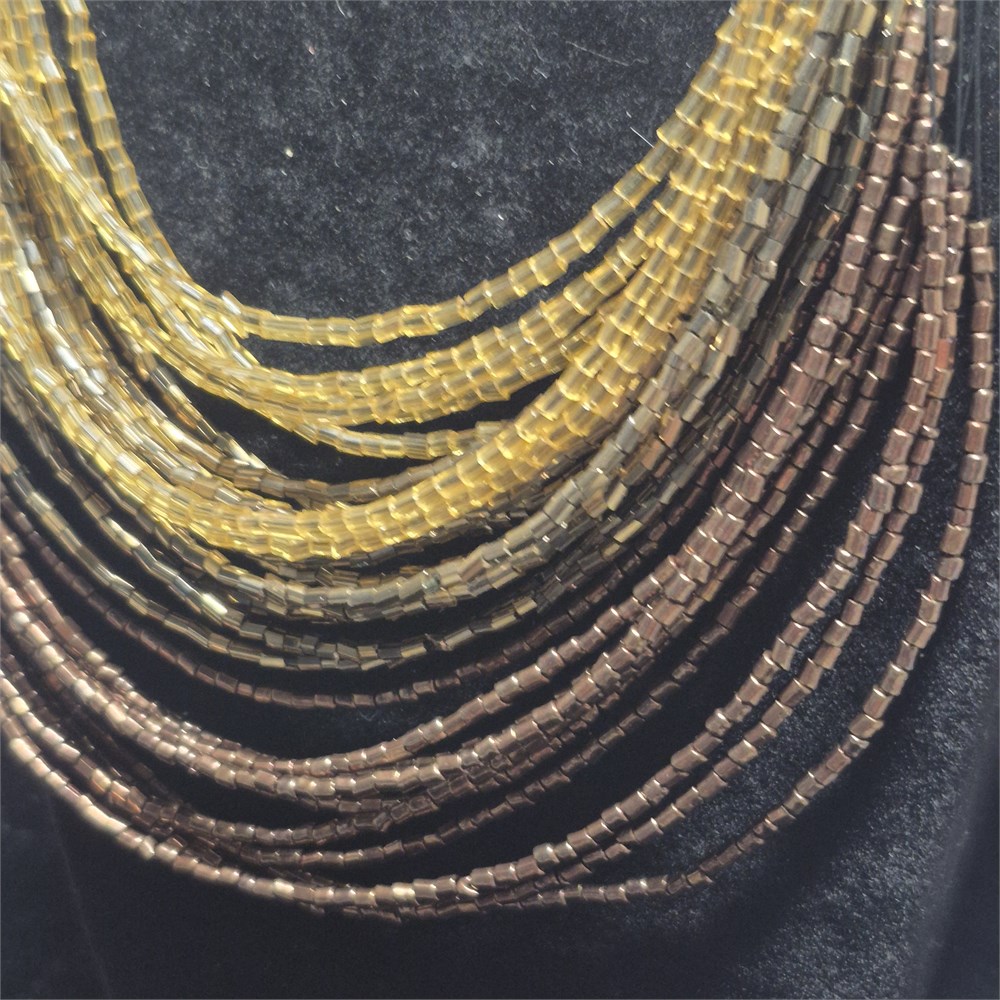 Necklace has multi strands of variated seed beads on black filiment