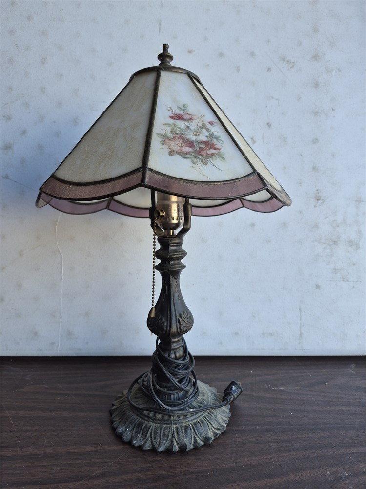 Nice vintage Tiffany Style lamp. Lamp stands 17" tall. Shade is glass. Base is heavy.