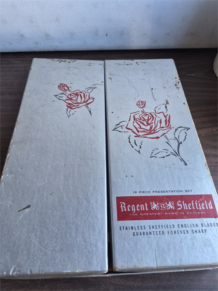 Nice regent sheffield knife set. There are 18 pieces included. Set is missing one knife. Box is in fair condition .