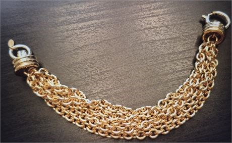 The product is a stunning vintage estate bracelet signed by Monet, featuring a gold tone design that exudes elegance and sophistication. This heavy 7 5/8" bracelet is a statement piece.