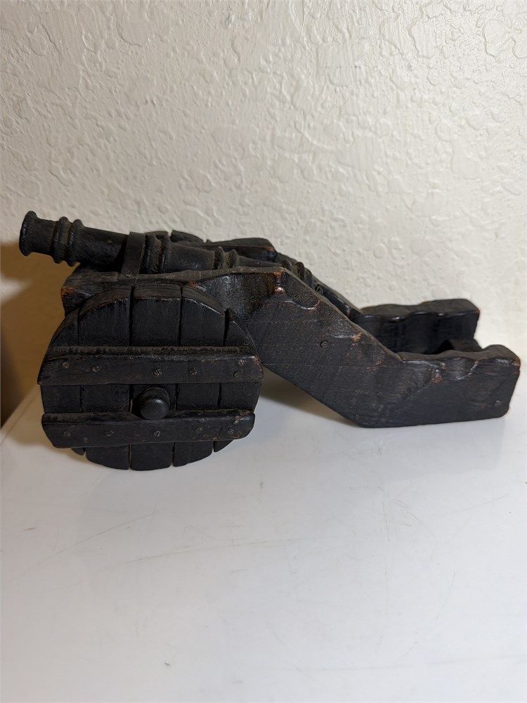 Wood & Cast Iron Cannon w/ Base Stand Primitive Vintage 9 1/2 x 4 1/2“