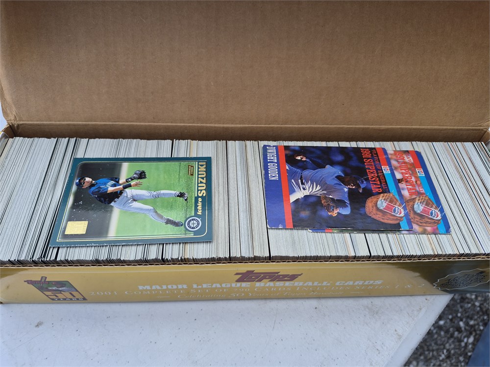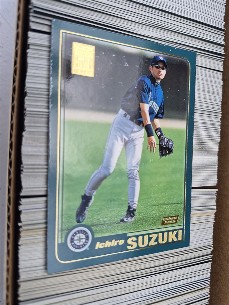 Box of mostly 2001 Topps Baseball Cards. Does include the Ichiro Suzuki Rookie (Card is Average Condition). Other star cards and HOFers. There are other year and brand cards included. Approximately 800 cards.