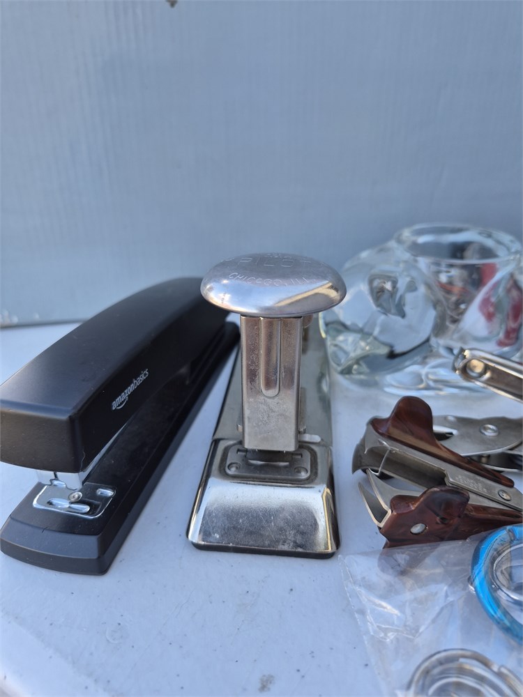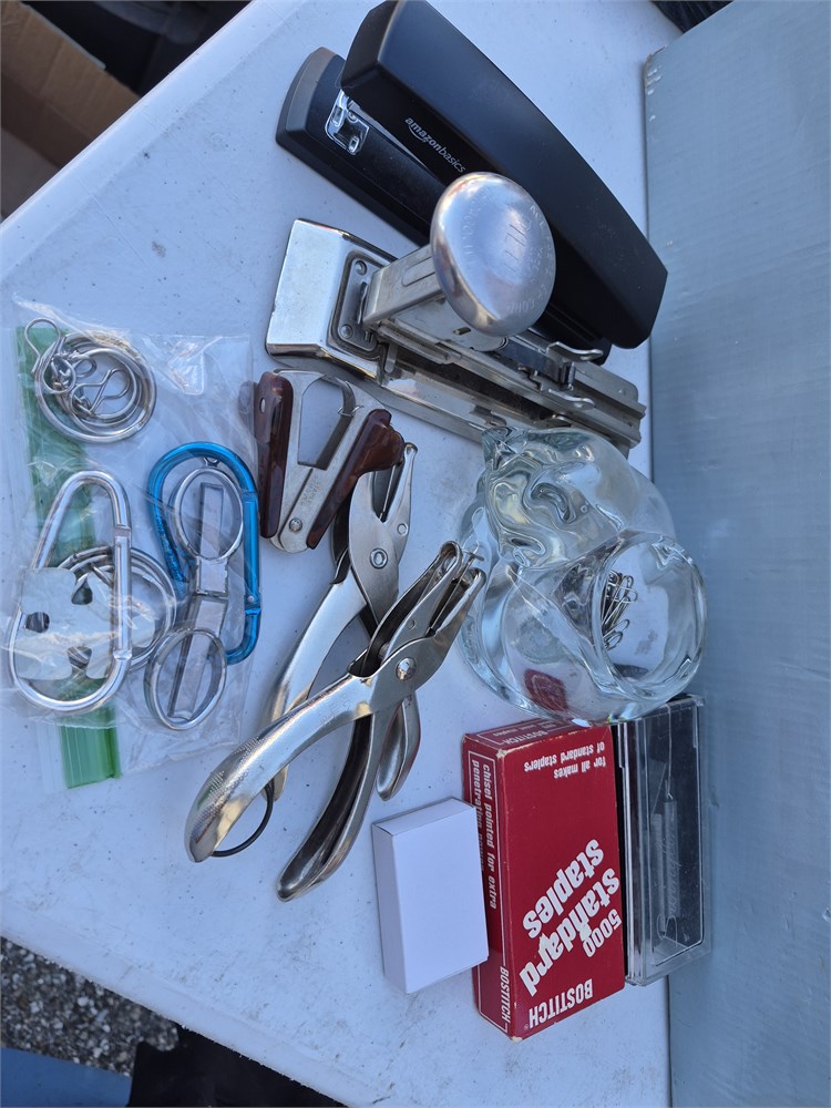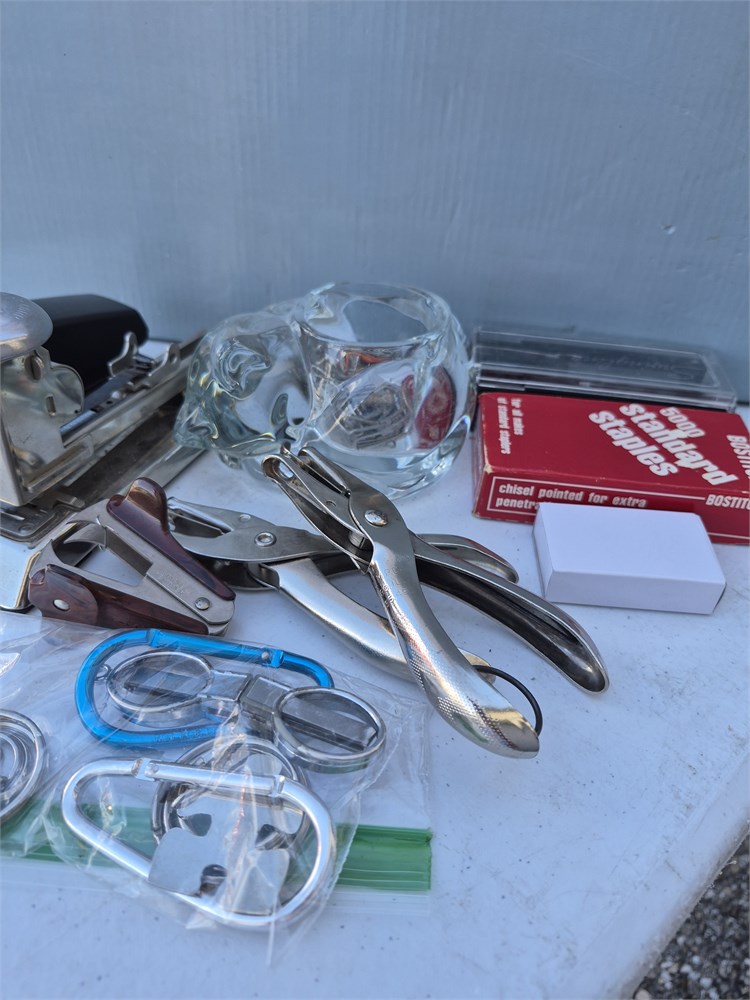 Lot of office Supplies. Includes staples, hole punches, paperclip glass holder and other items.
