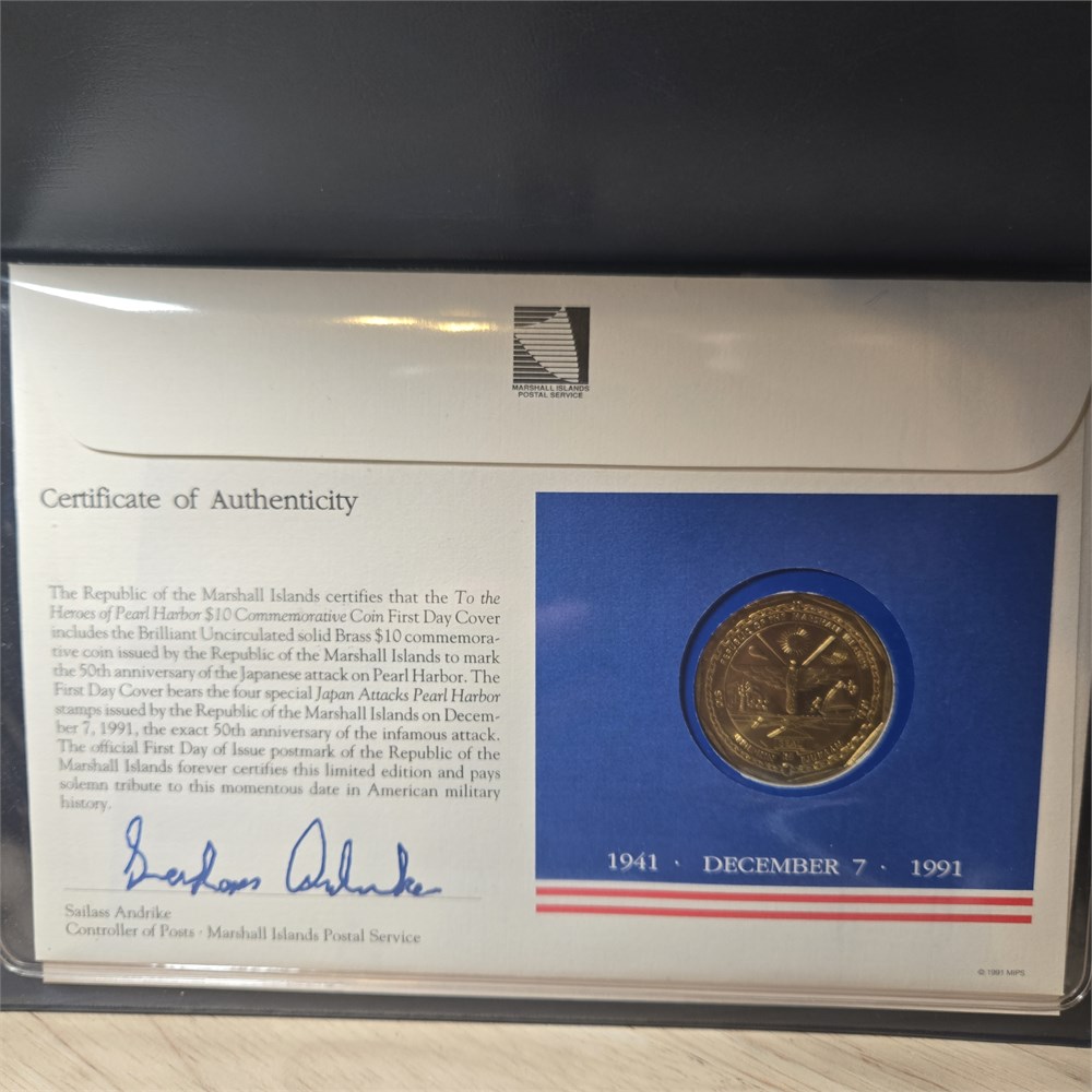 $10 uncirculated Brass Commemorative Coin and Marshall Islands Stamps First Day of Issue Cover Set