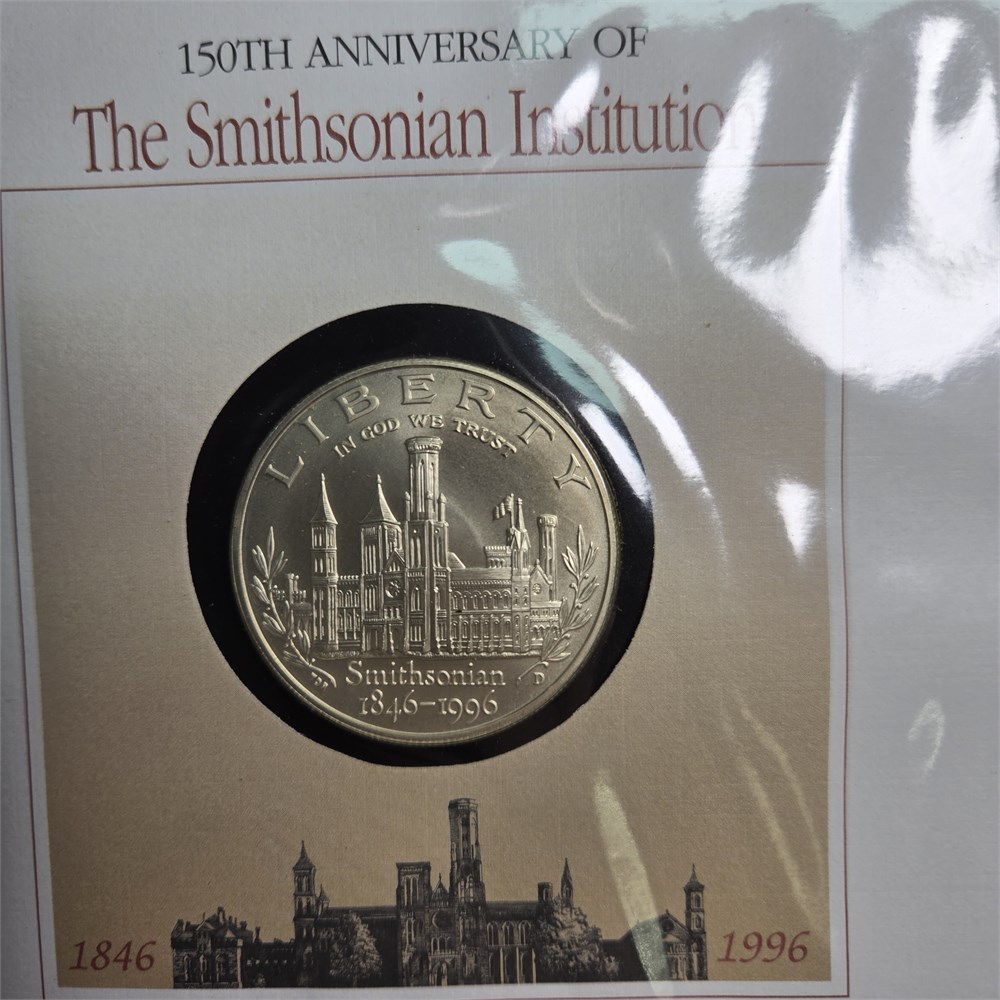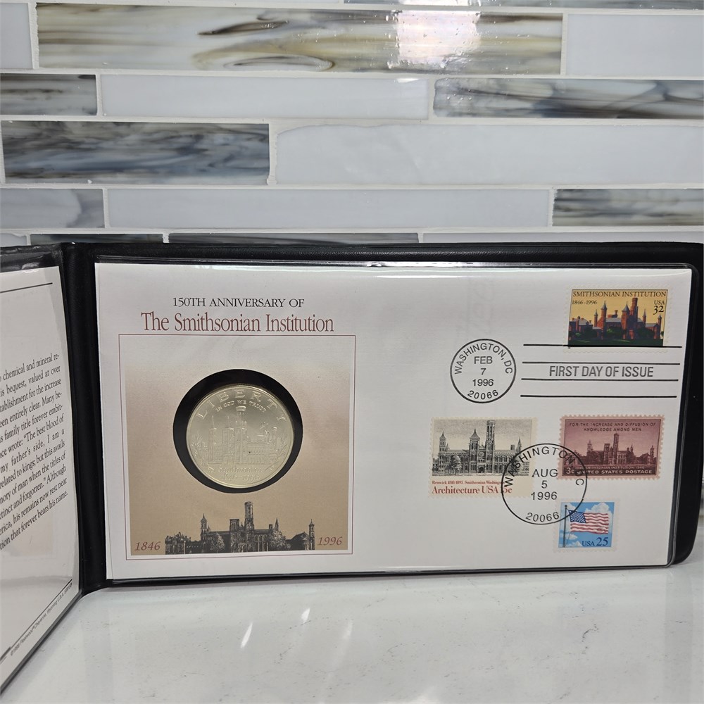 1996 uncirculated commemorative Silver Dollar .900 pure silver coin and 4 Smithsonian Institution stamps