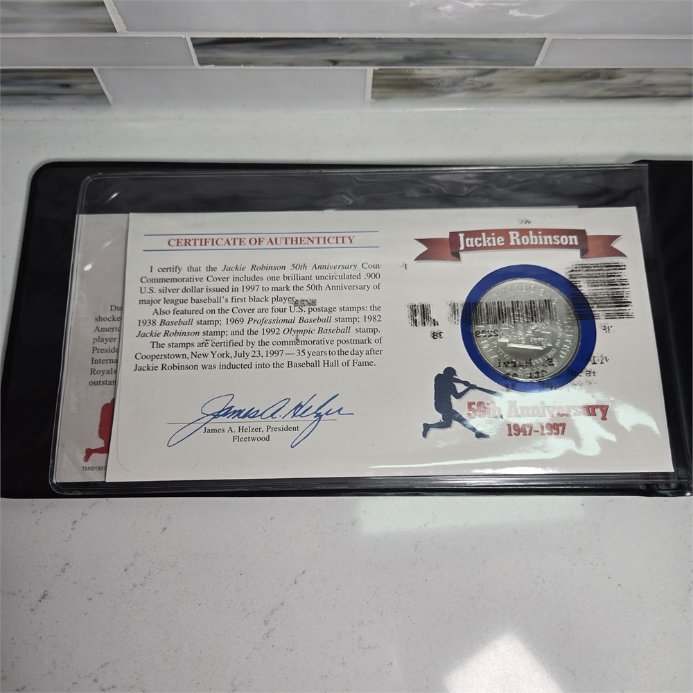1997 uncirculated Silver Dollar .900 pure silver coin and 4 Jackie Robinson stamps