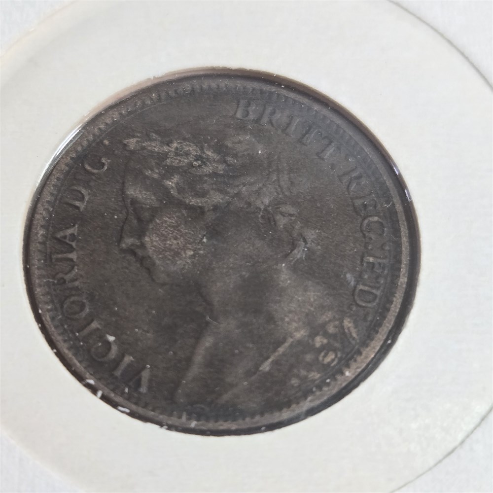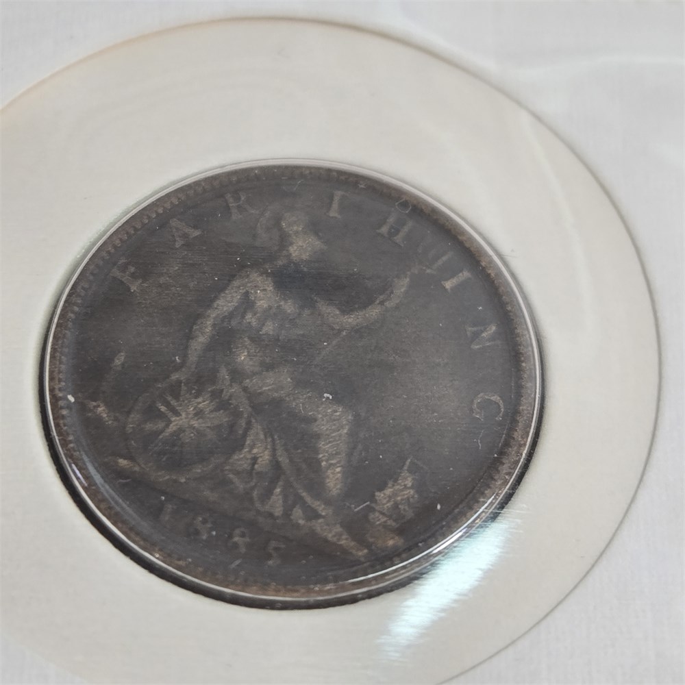 1889 Bronze English Penny and 1885 Bronze Englis Farthing coin and 5 stamps