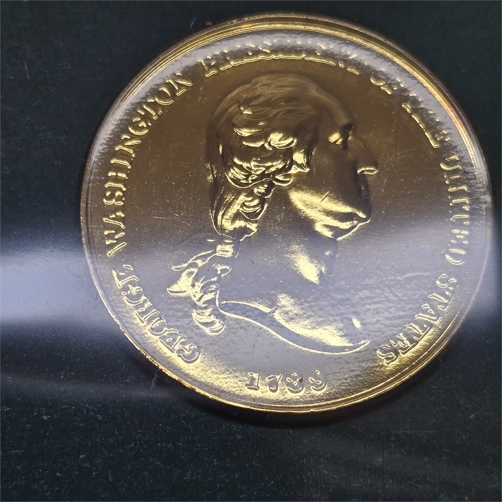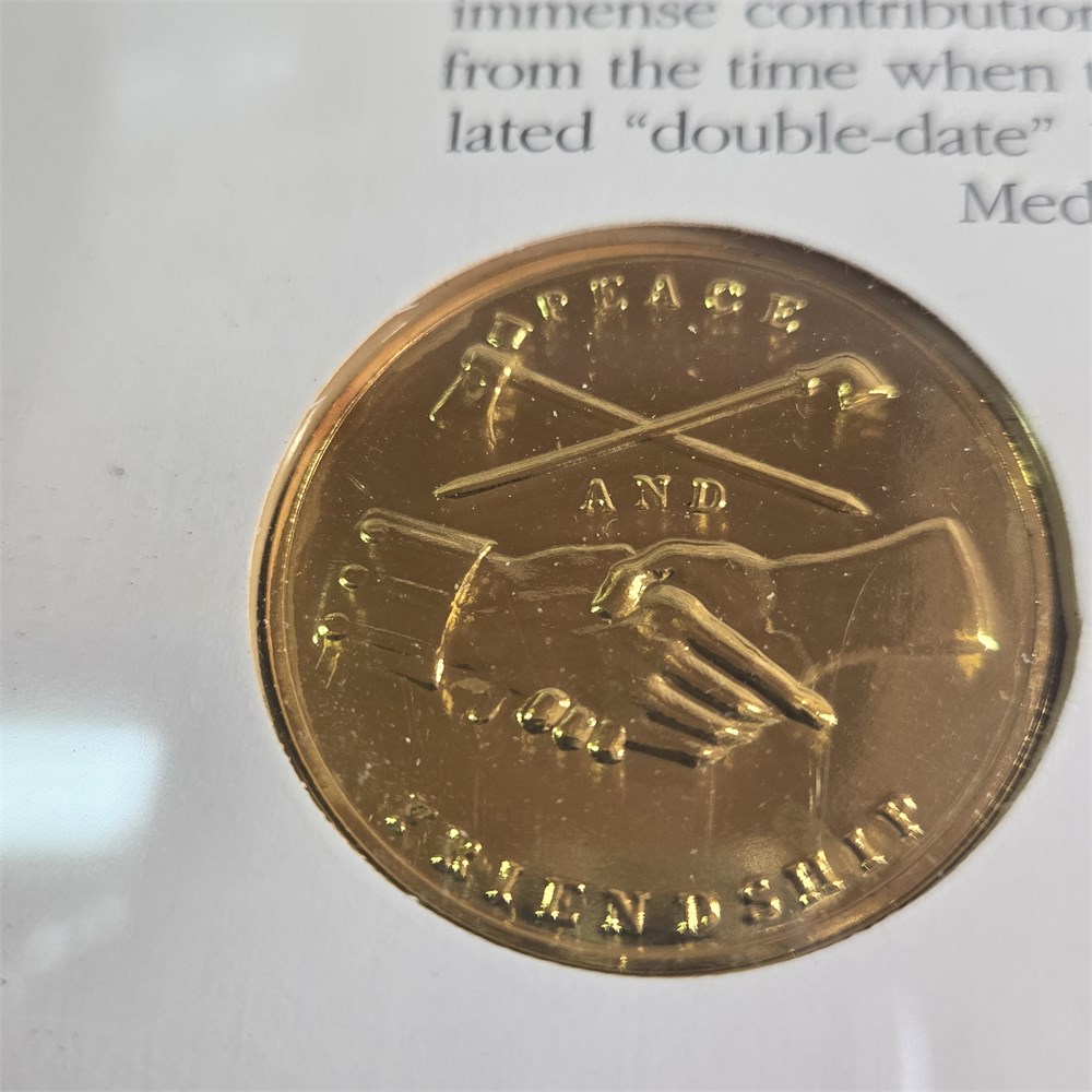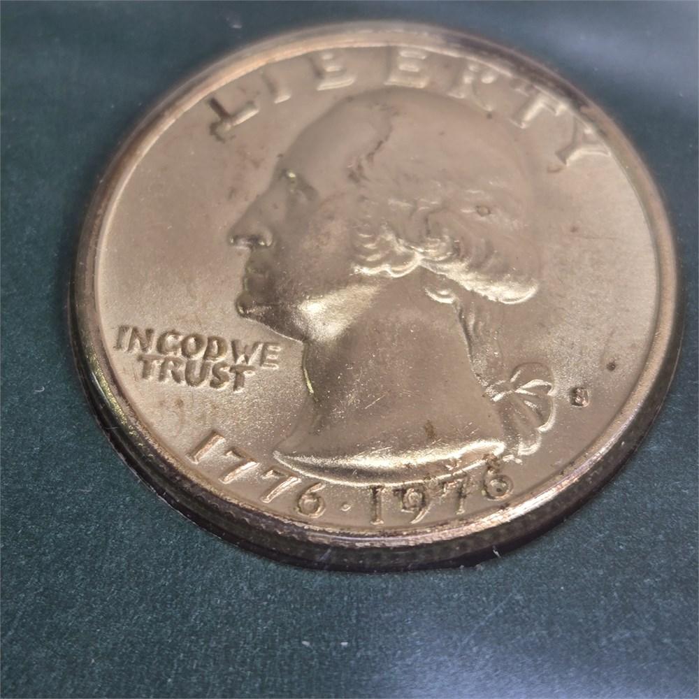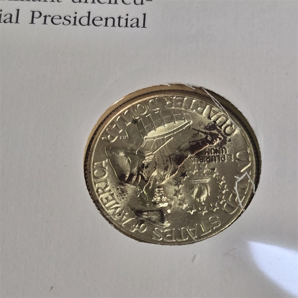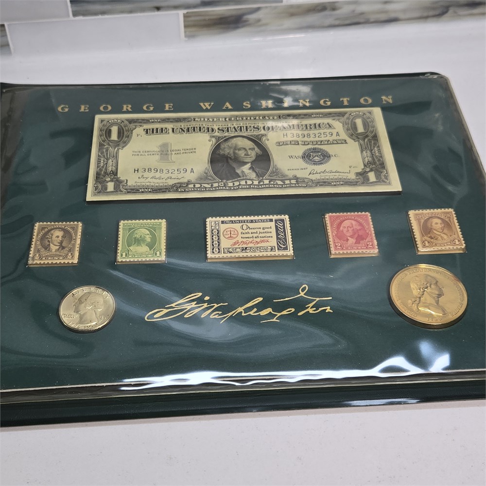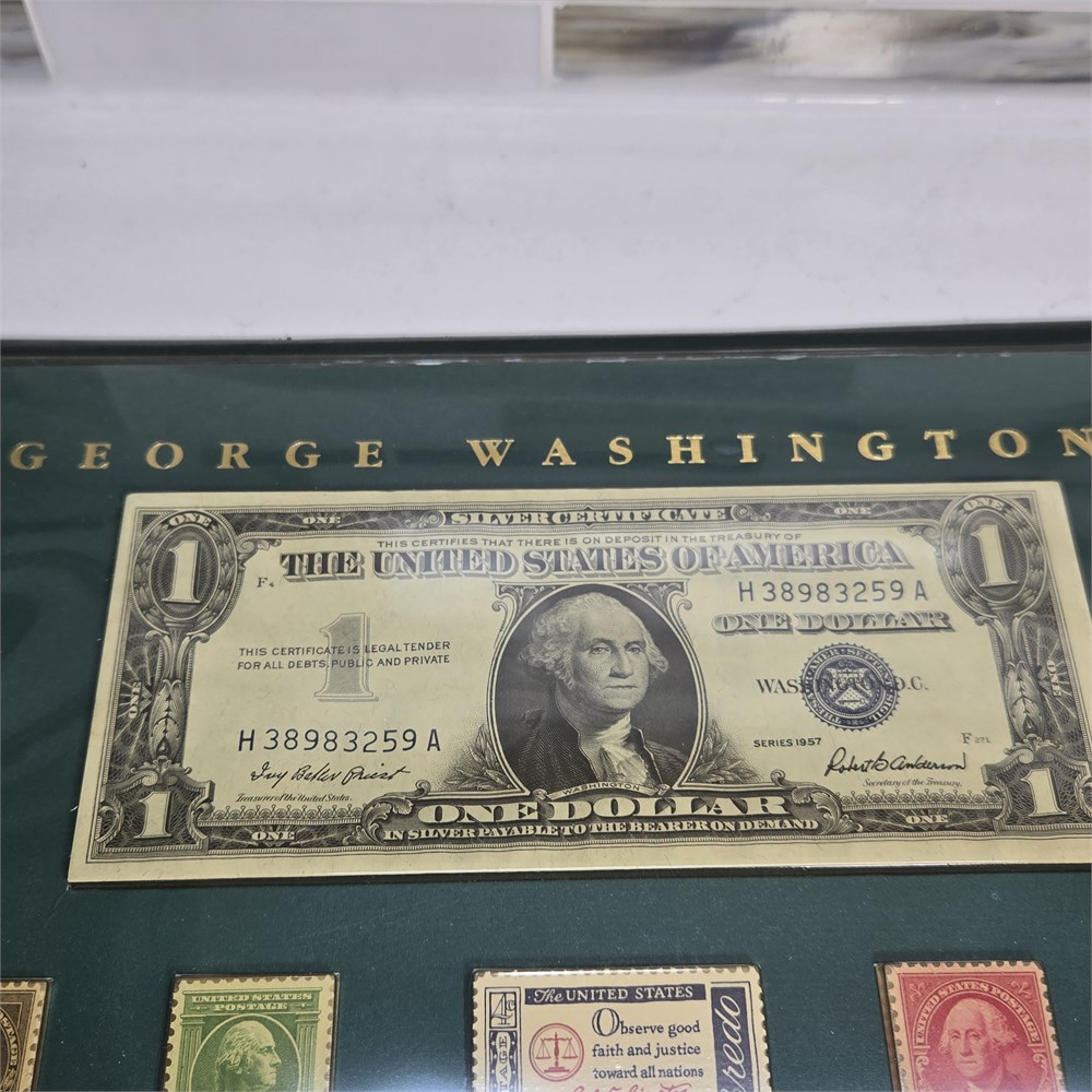 1957 $1.00 Silver Certificate Bill, 1776-1976 uncirculated double-date .400 silver Bicentennial Quarter and 1789 Commemorative Medal Coin struck in bronze and layered with 24k gold and 5 stamps