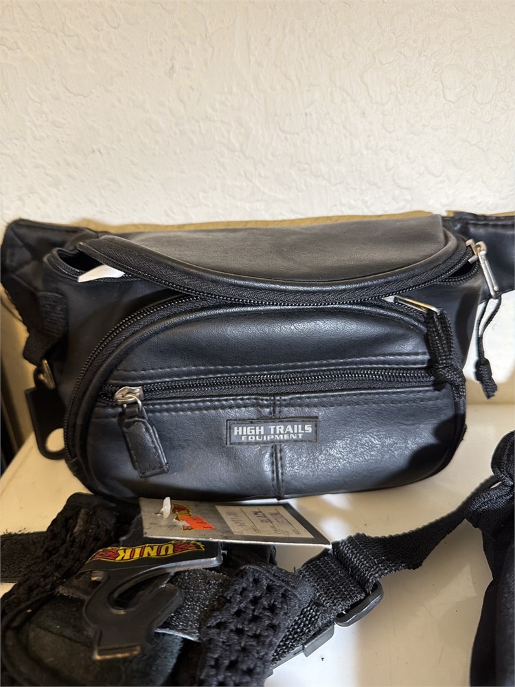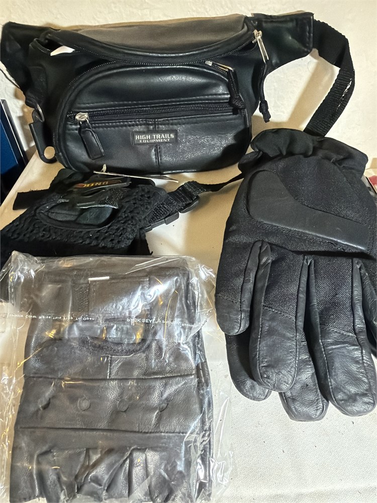 Hi trail equipment, waste purse, two finger list, leather gloves, one full glove look to be motorcycle equipment all new