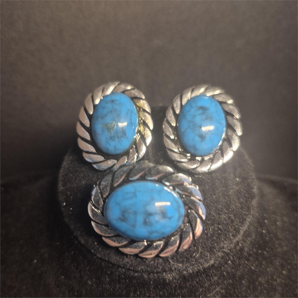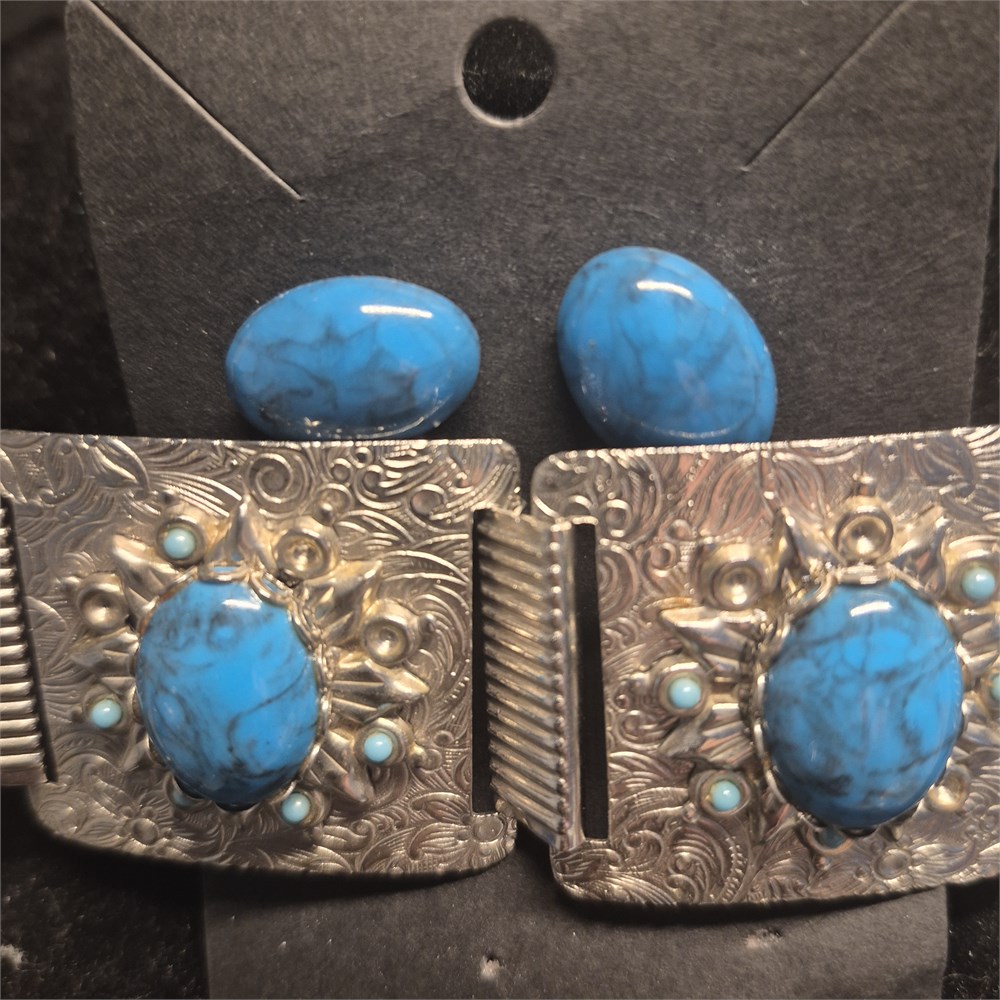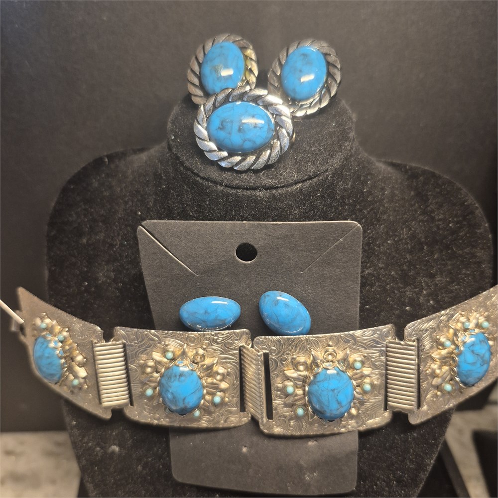 Vintage Turquoise on silver 3 panel Bracelet / Earrings coord.