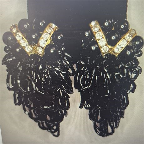 Vtg Art Deco 20s(?) Rhinestone Black Beaded Chandelier Statement Earrings
