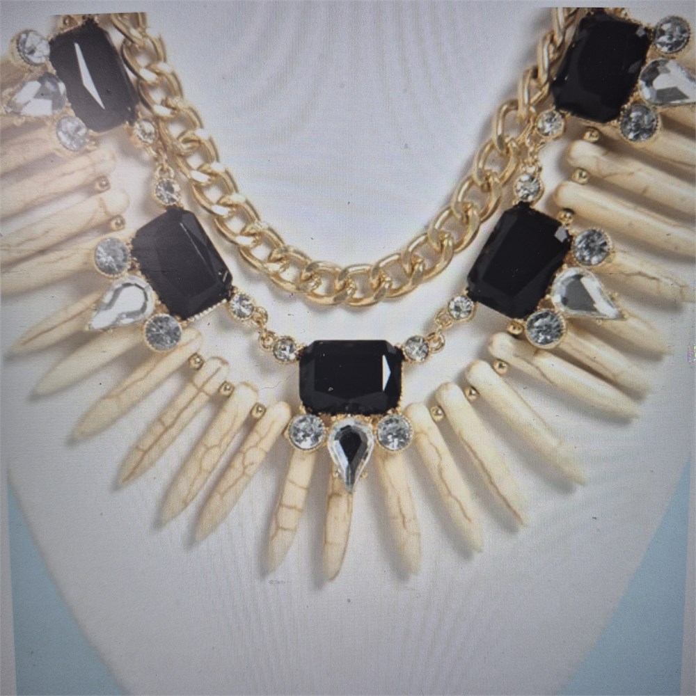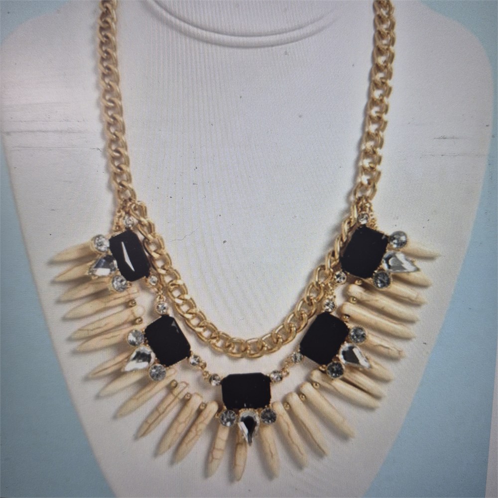 You don't need to scour the planet for hidden treasures to get the jet-setter look, thanks to the Trinket Belle Black and Ivory Statement Necklace! Three tiers of trinkets begin with a thick golden chain, with a string of black and white rhinestones below, followed by a worldly collection of ivory-inspired beads that make a pointed statement between golden beads along the bottom rung. Necklace dangles approximately 3.5" at longest point, and measures 16" around, plus a 3" extender. Lobster clasp closure. Man made materials.