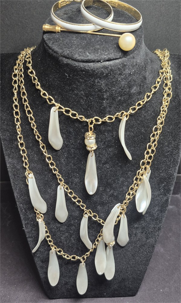Feather shaped Necklace w/ Earrings & Pearl stick pin
