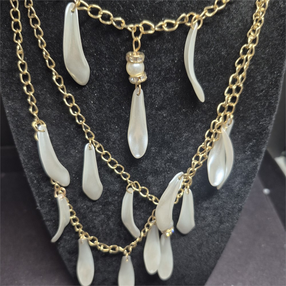 Necklace is feather shaped gold multi strand