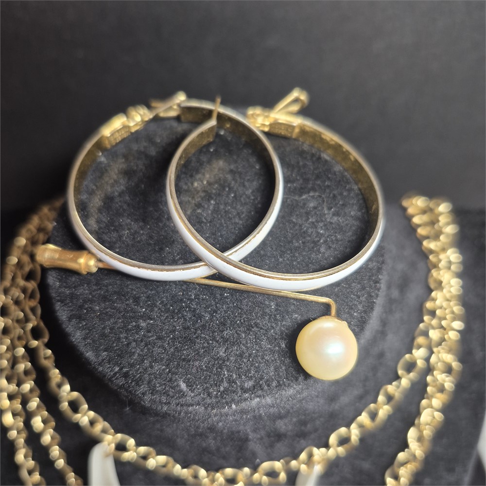 white enameled hoop earrings and stick pin