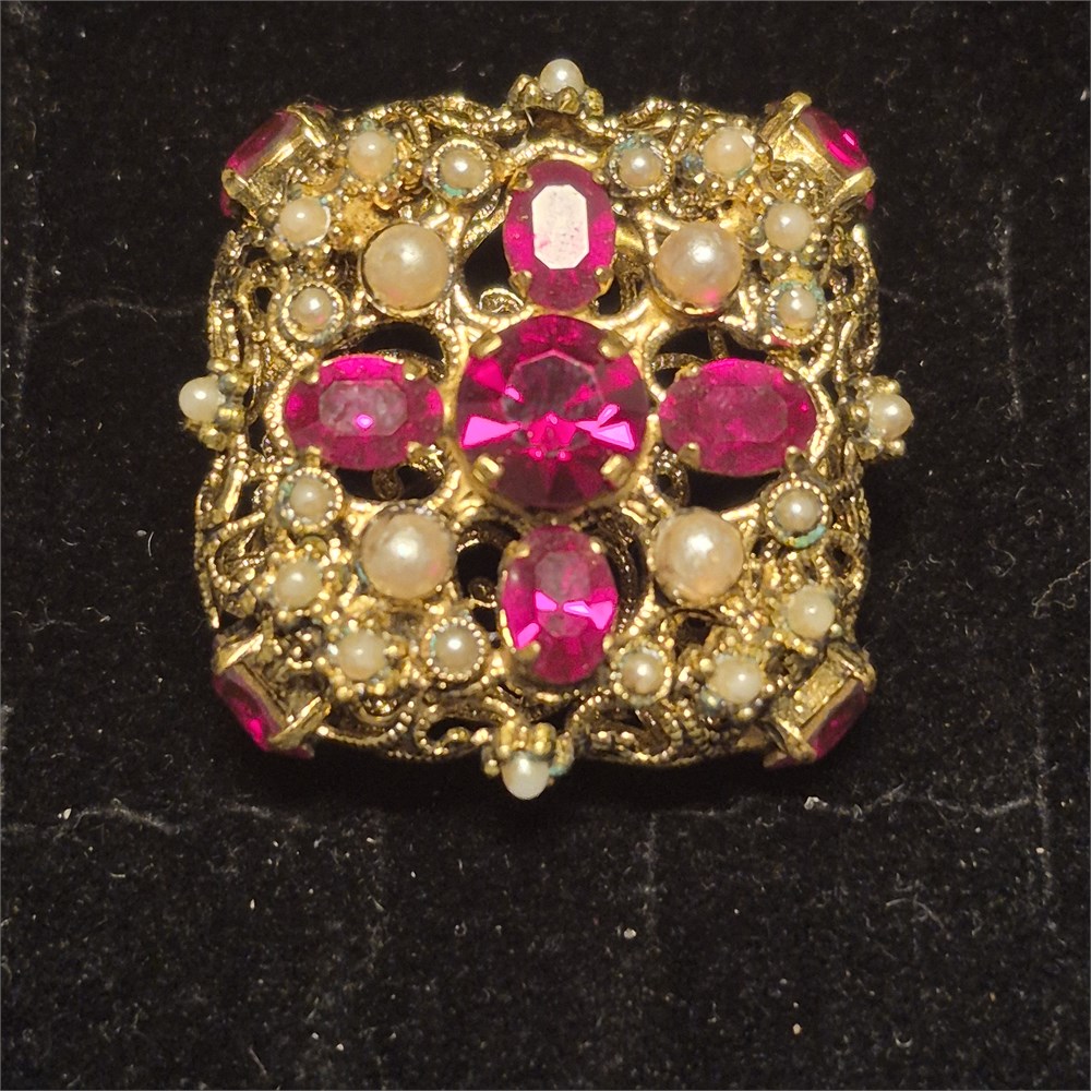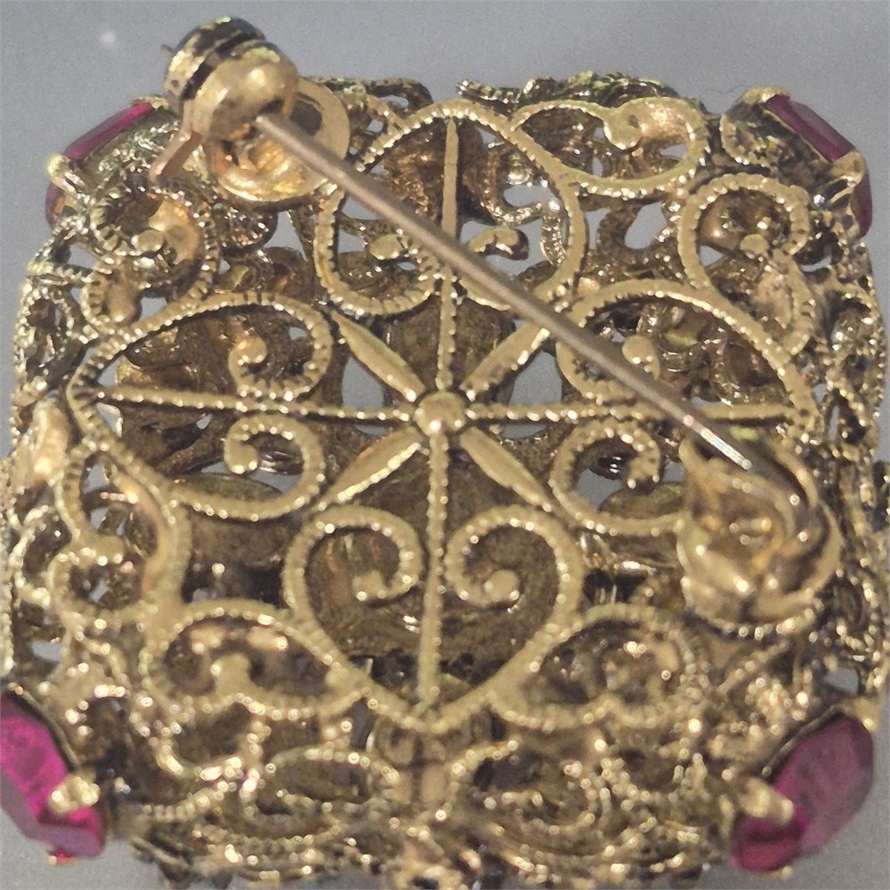Vintage gold filigree BROOCH w/ Ruby & Pearls