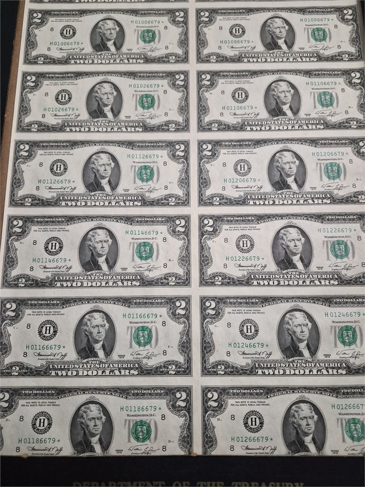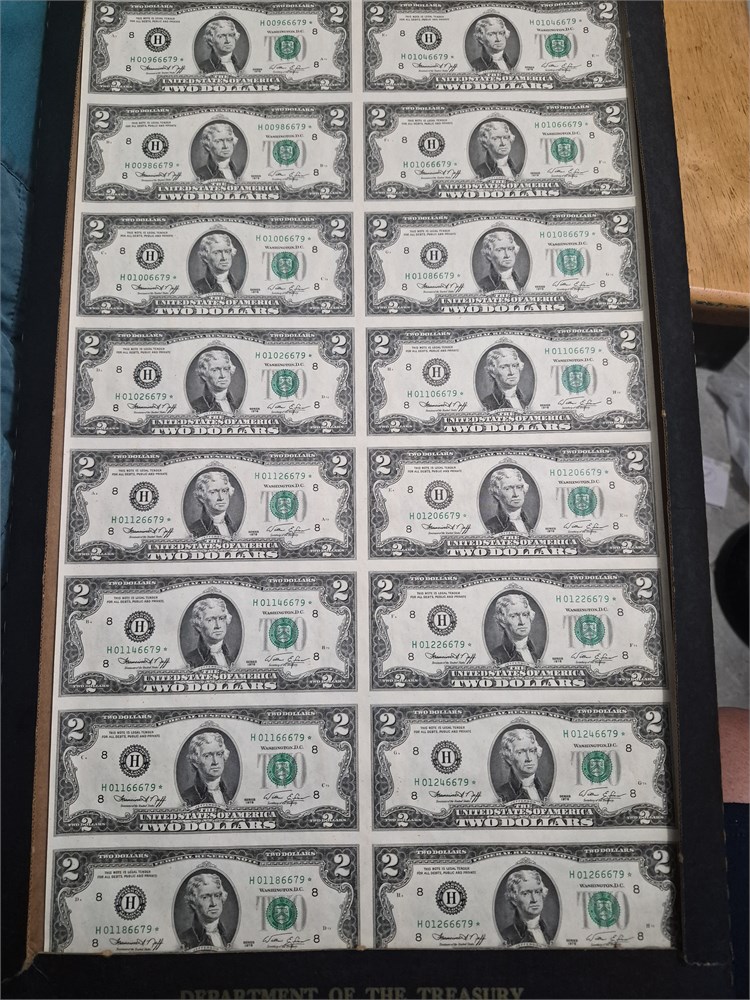 Uncut Sheet of 16 Two Dollar Bills