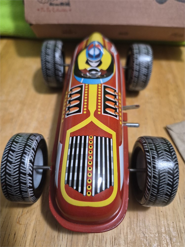 Very nice reproduction tin raver car. Comes in Box.