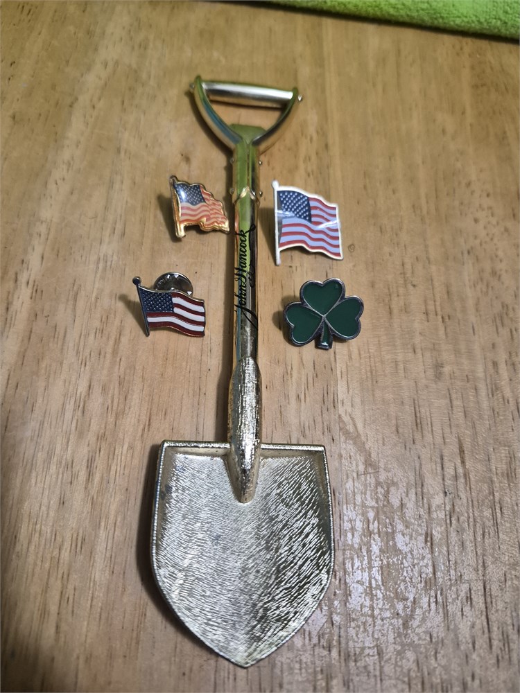 Souvenir Brass 7" Miniature Shovel Bottle Cap Opener John Hancock and 4 pins. Pins include 3 US Flags and 1 Shamrock.
