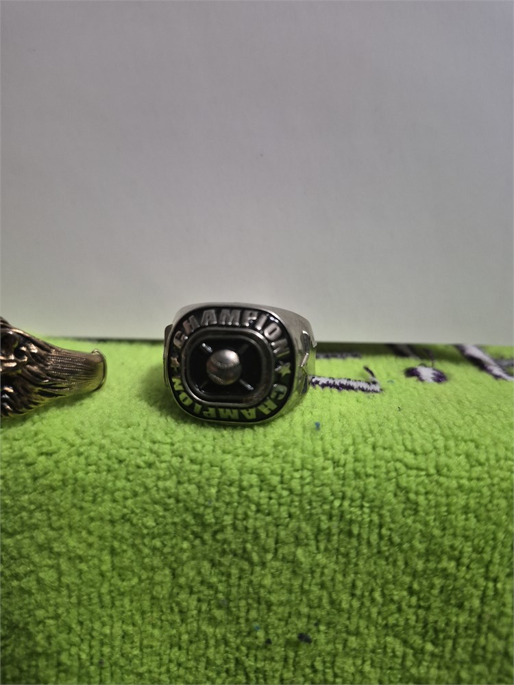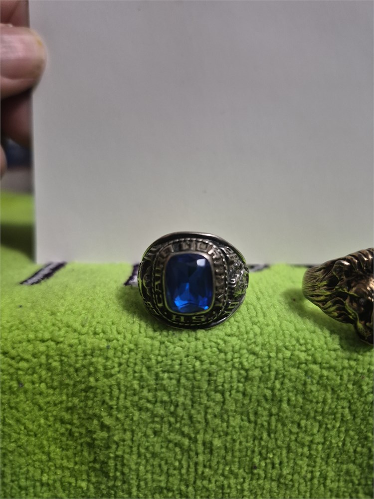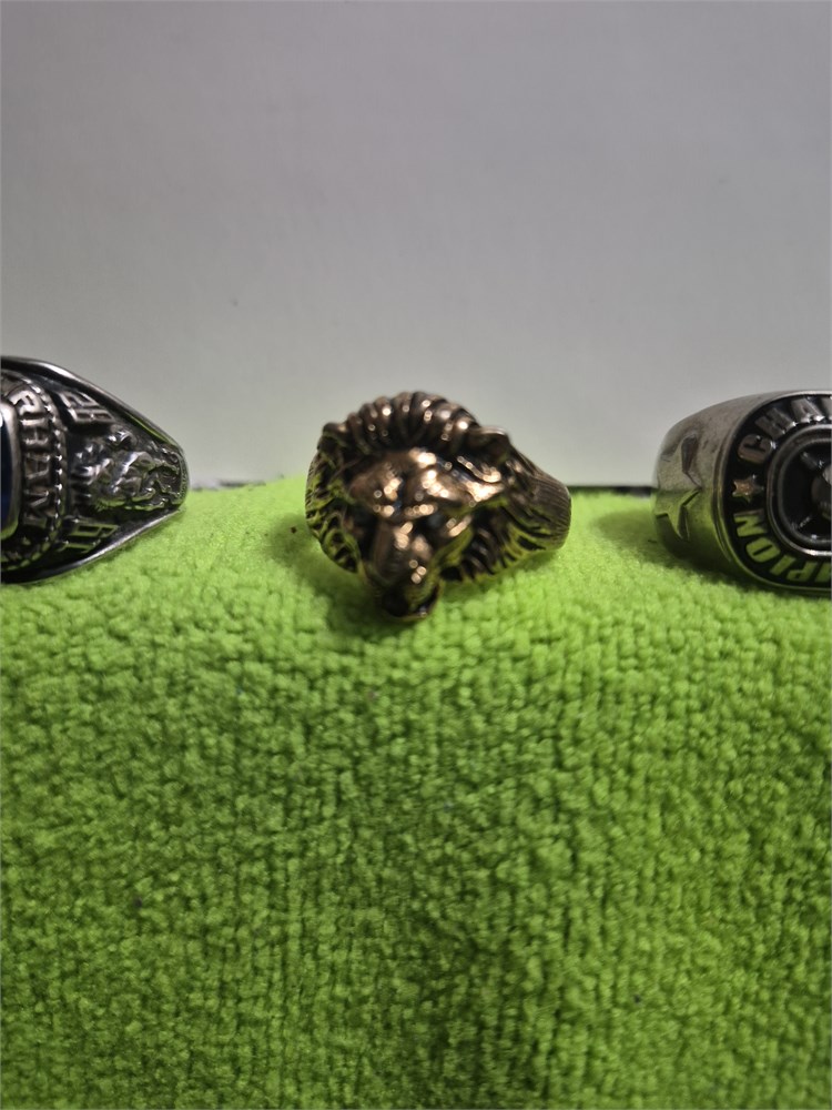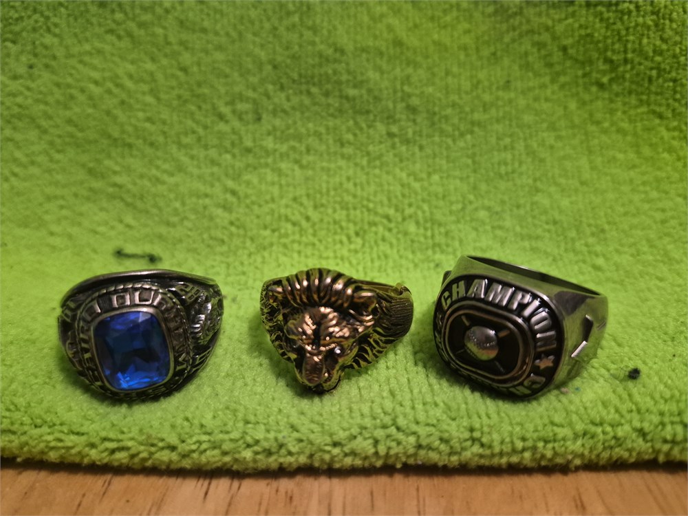3 costume rings includes one champion ring. One lion head ring lion head is marked 18k high grade electroplate, and then one school ring.