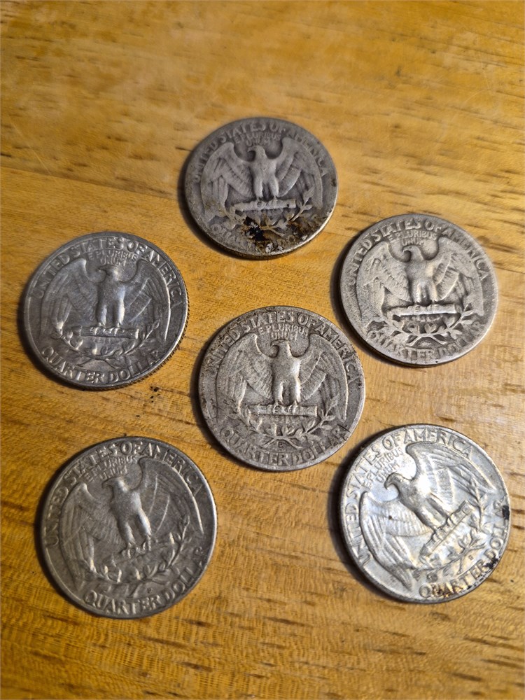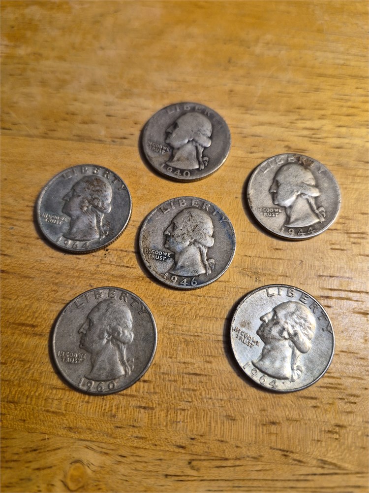 Lot of 6 Washington Silver Quarters. Dates 1940. Two 1944, 1946, 1960 and 1964.