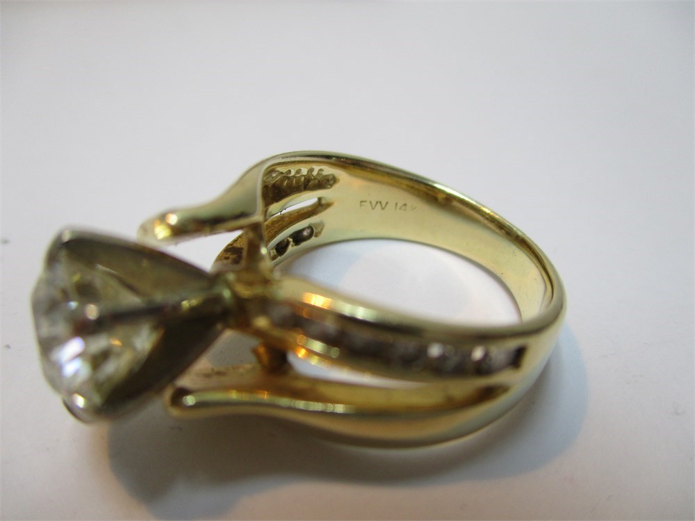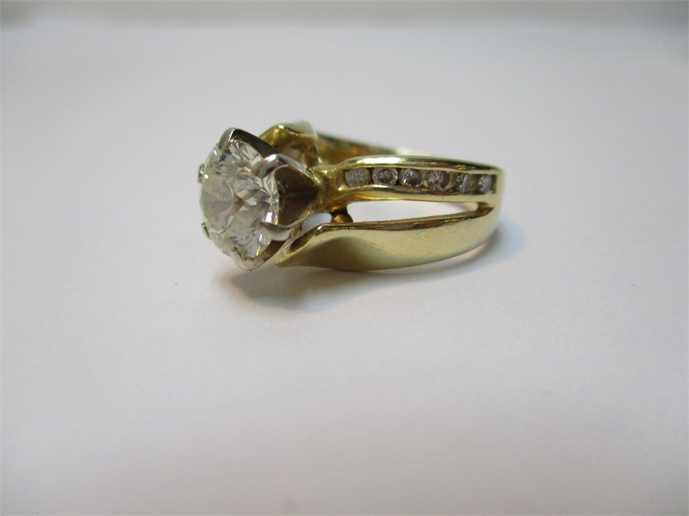 This is a Stunning 14K Yellow Gold &  Round Faceted Diamond Ring. center stone is 1.2 Ct, & 1.36 total and  6.71g TW.  Size 4.5-5.  The band has a semi-split shank with Diamond accents on one part of the shank and on the other, solid gold that seems to wrap in a wave design.  The Large Faceted Diamond sits high on a 6 prong setting. It is very comfortable to wear with a silk fit on the inside of the band.  This is a Beautiful piece!