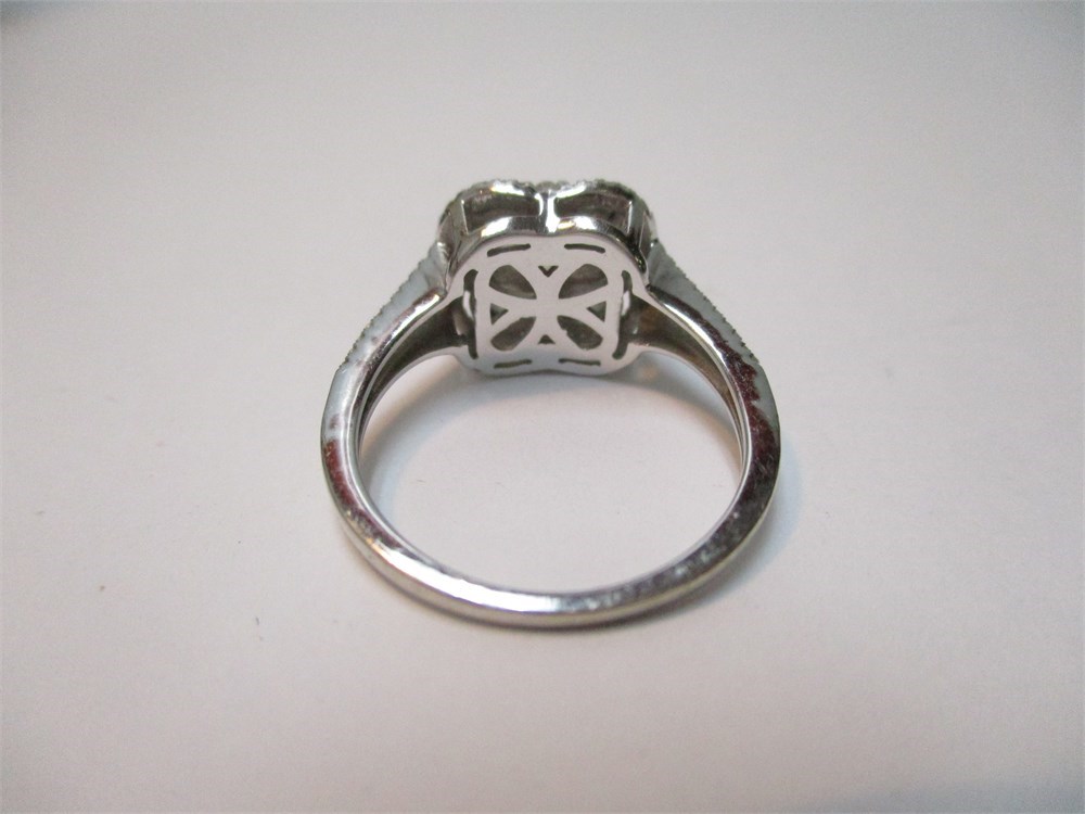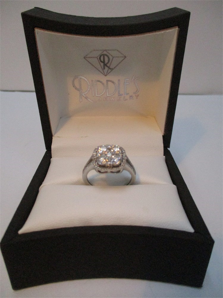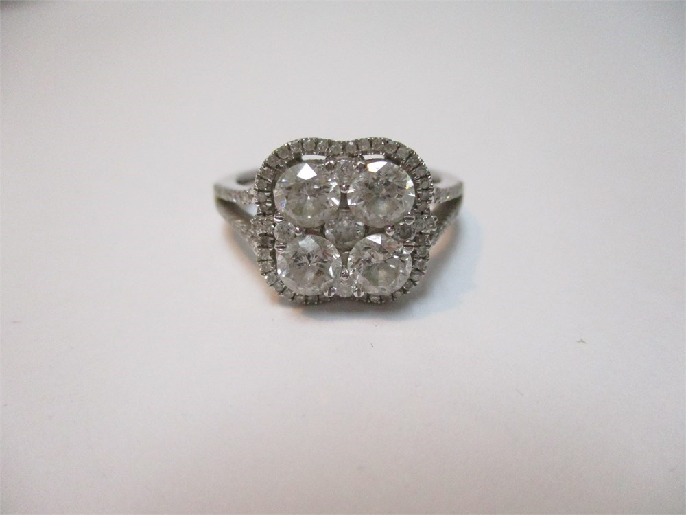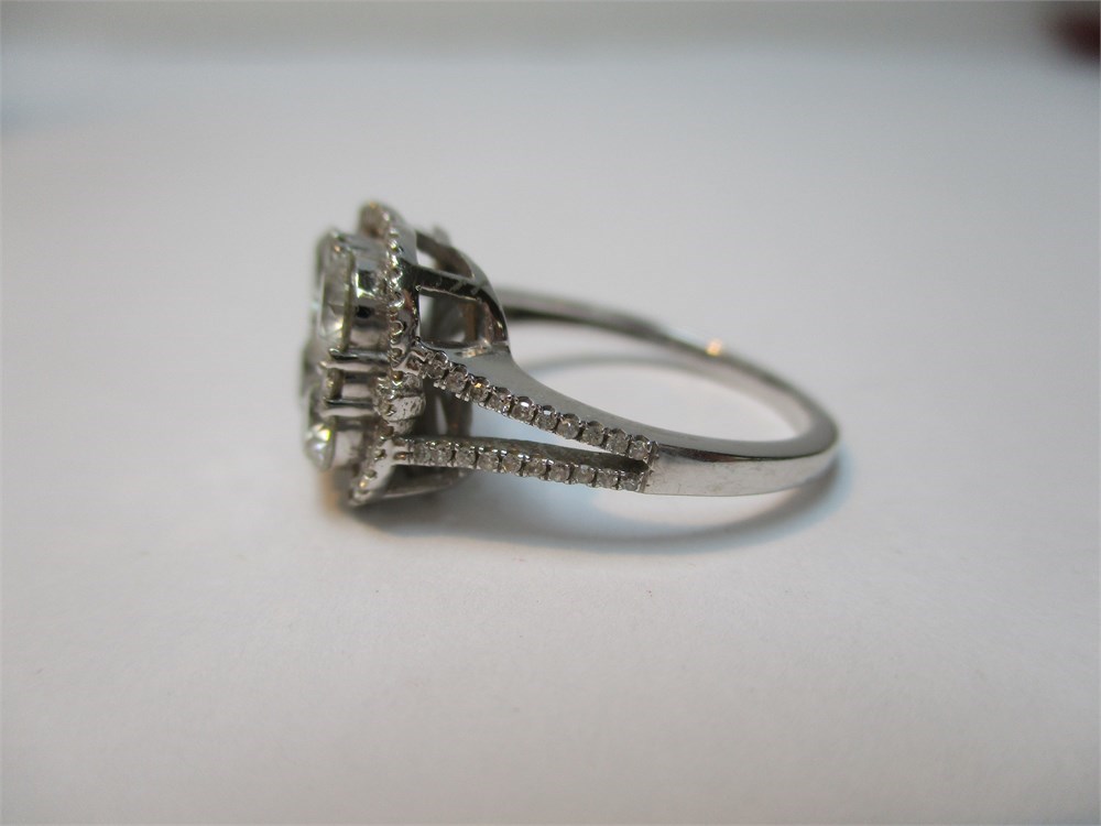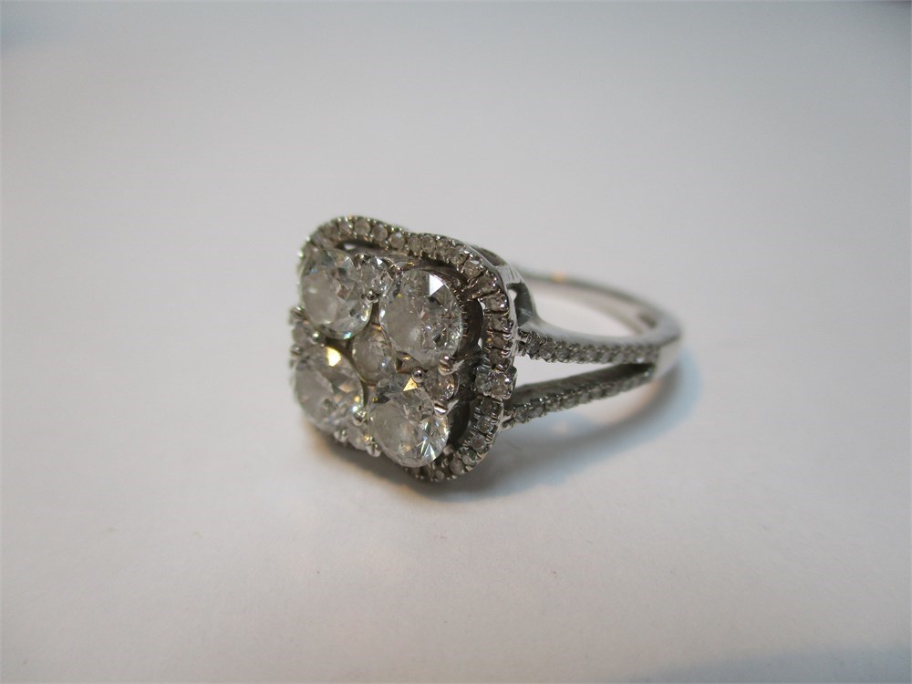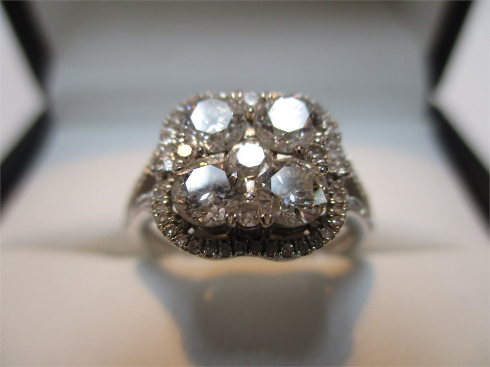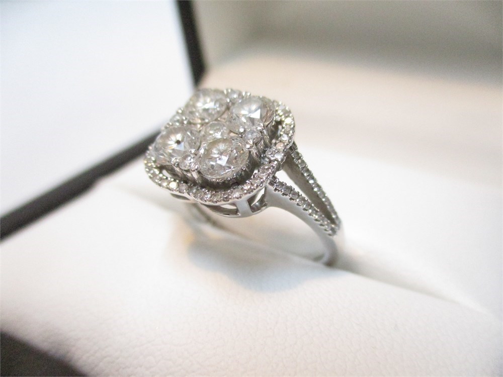 This is a Stunning 14K White Gold & Round Faceted Diamond Ring, 3.92g TW. Size 7. It has 5 Round Center Stones framed by smaller diamonds, along with small diamonds on the split shank.  There is a lot of bling with this ring!   I believe this is the original box.