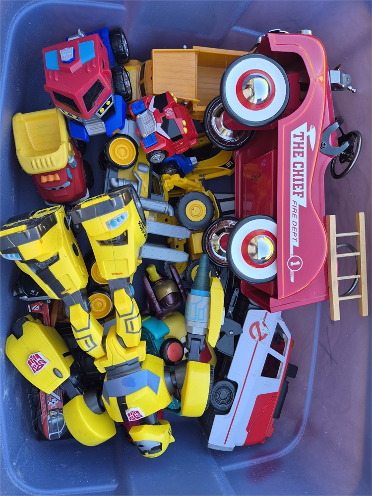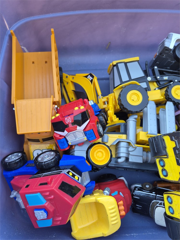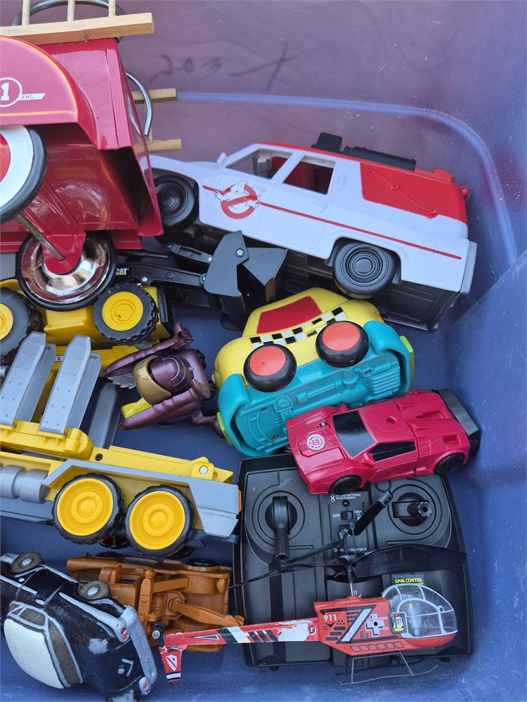 Nice lot of toys includes Transformers fire truck Ghostbusters RC helicopter and construction vehicles.