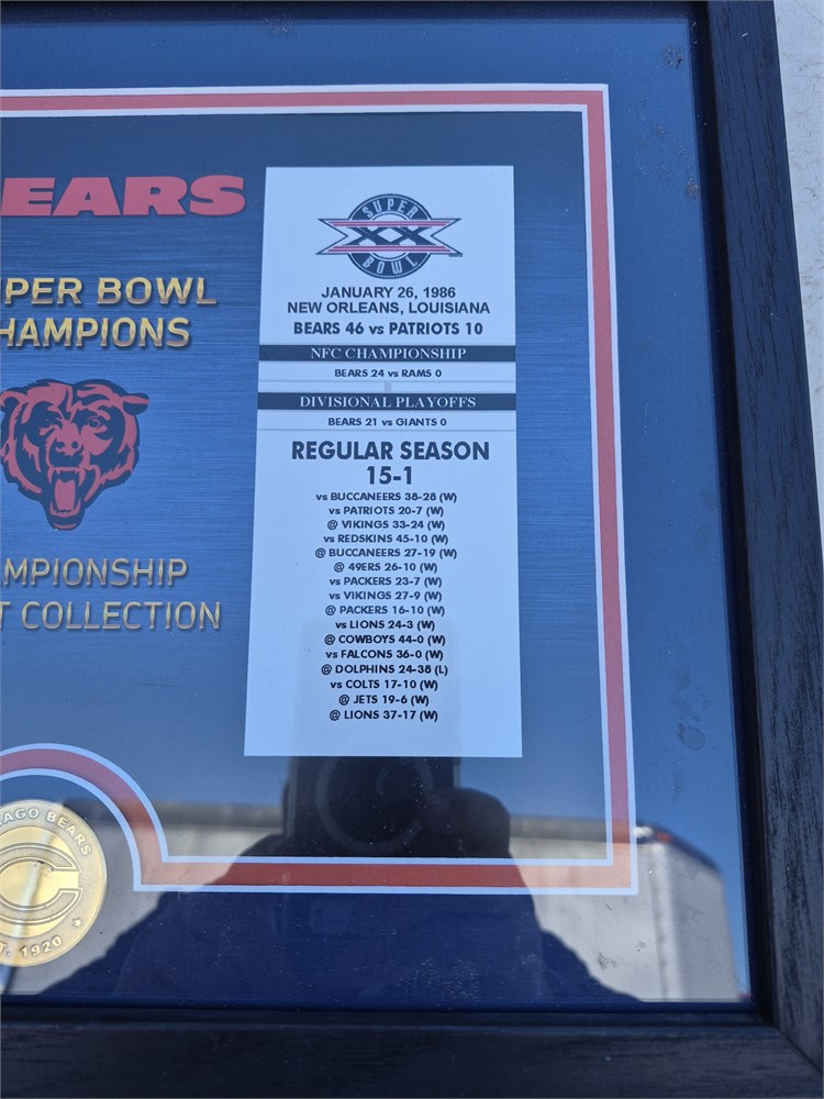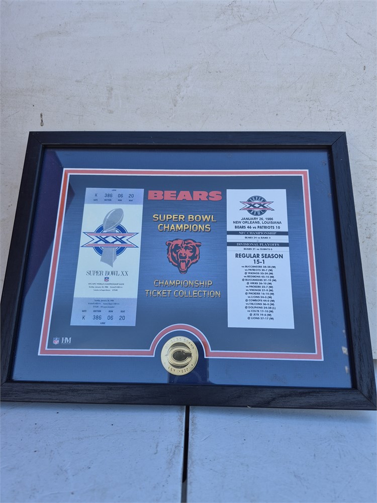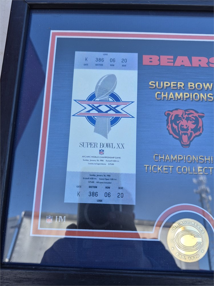 Chicago Bears Super Bowl champions championship ticket collection. Comes with replica ticket of the Chicago Bears 1986 Super Bowl season. Has a nice Chicago Bears coin included and is framed.