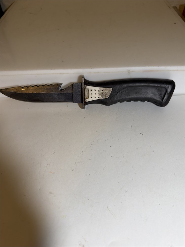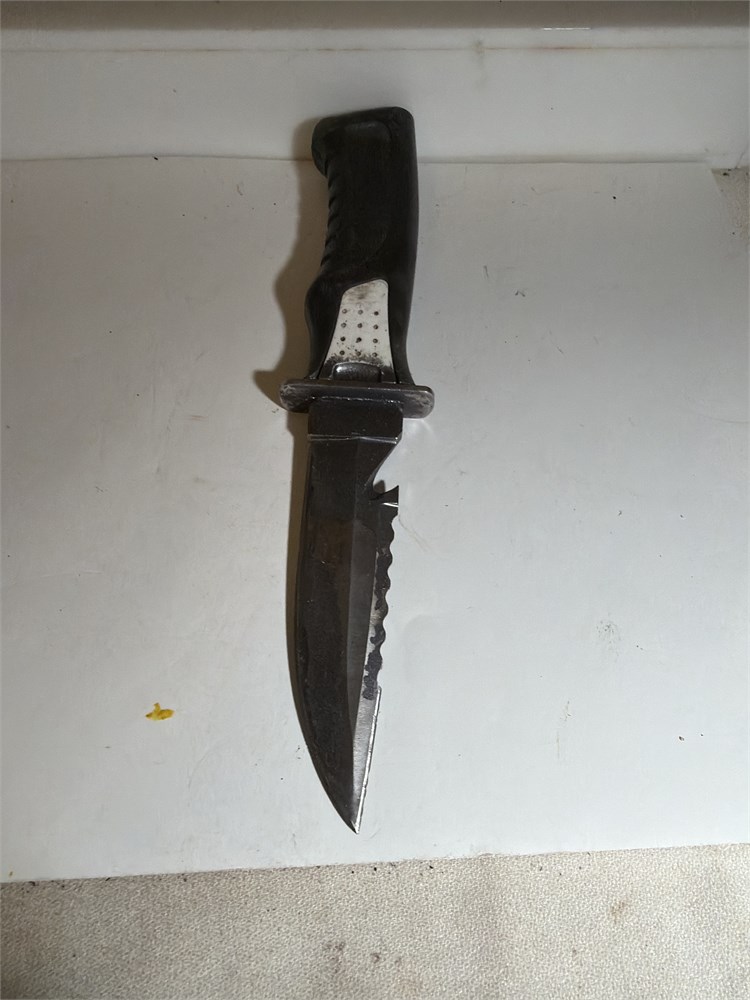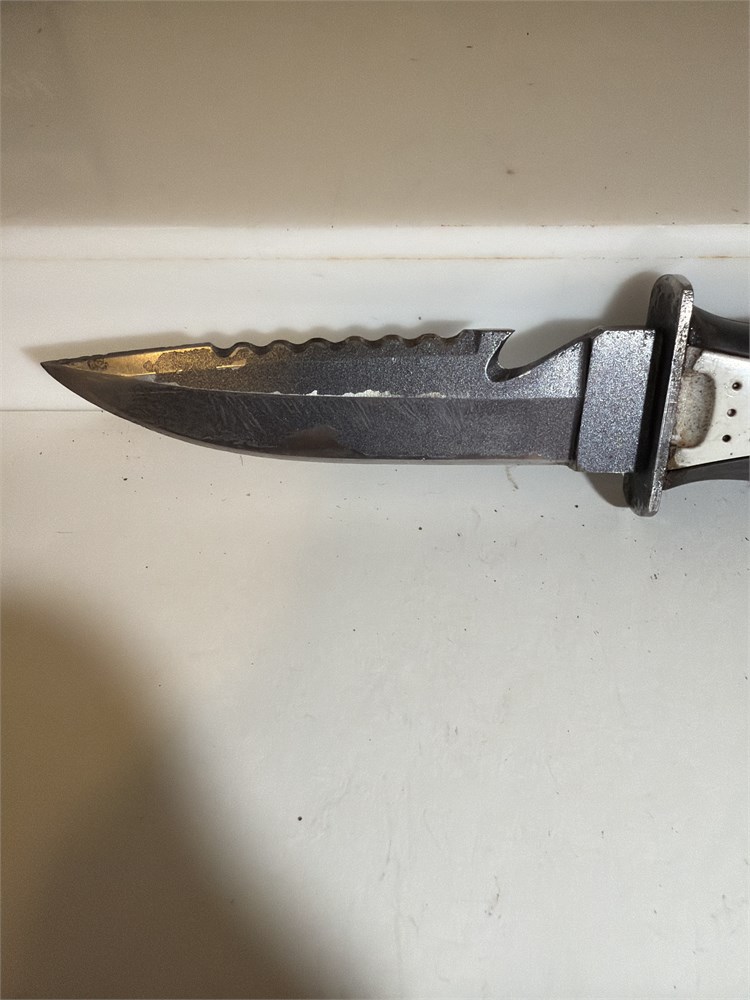9 inch hunting gut, knife, white, and black stain stainless blade